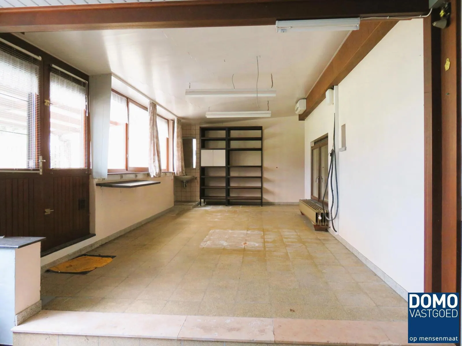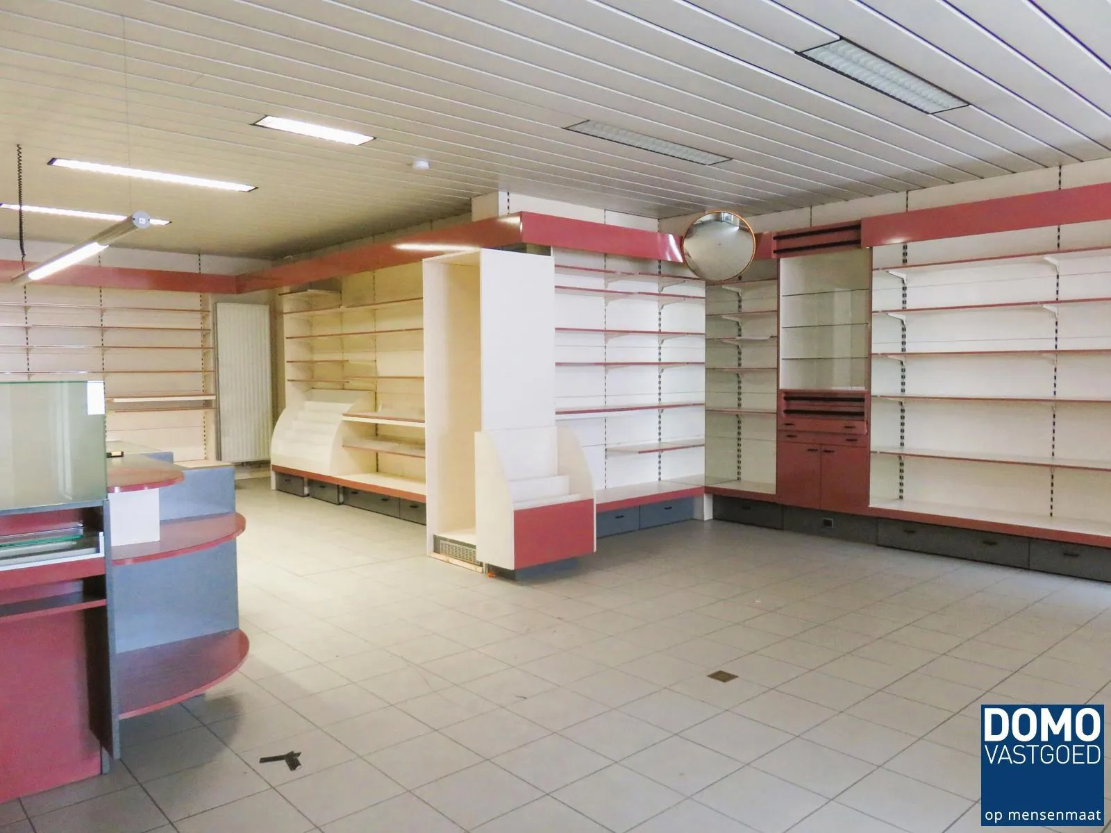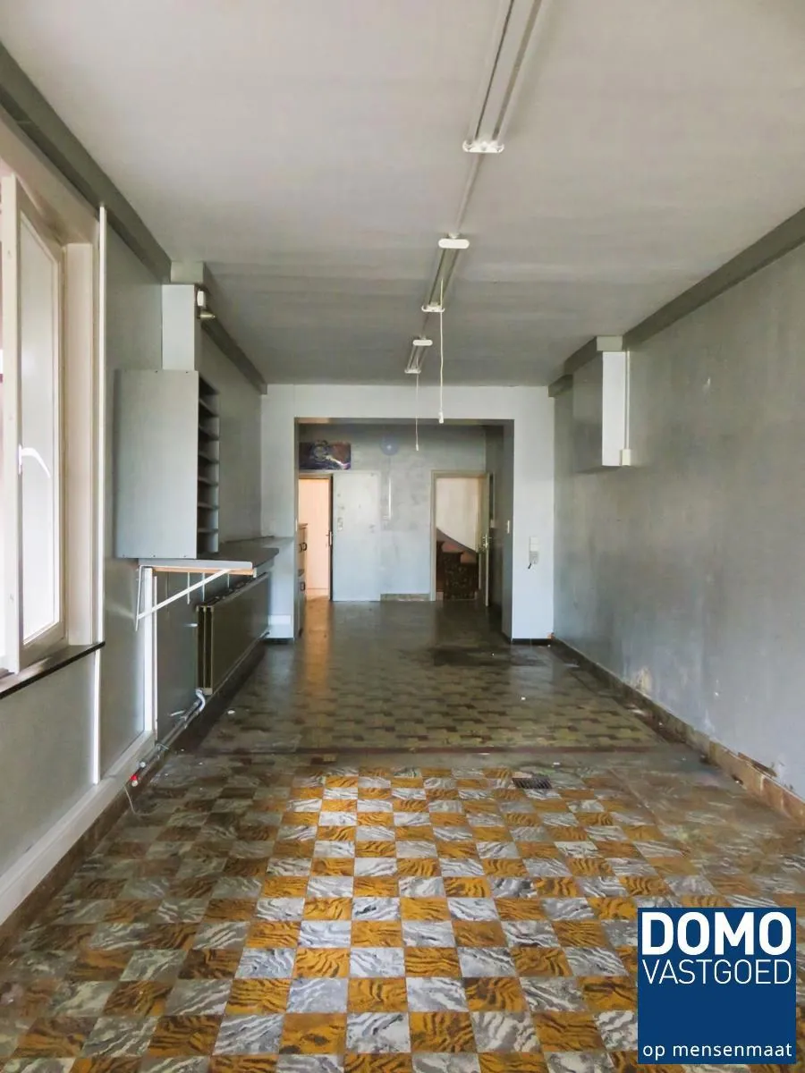 De indeling is als volgt: voorzijde twee handelsruimtes met aan de achterzijde ruime werkplaats, keuken, bureel en woongedeelte.