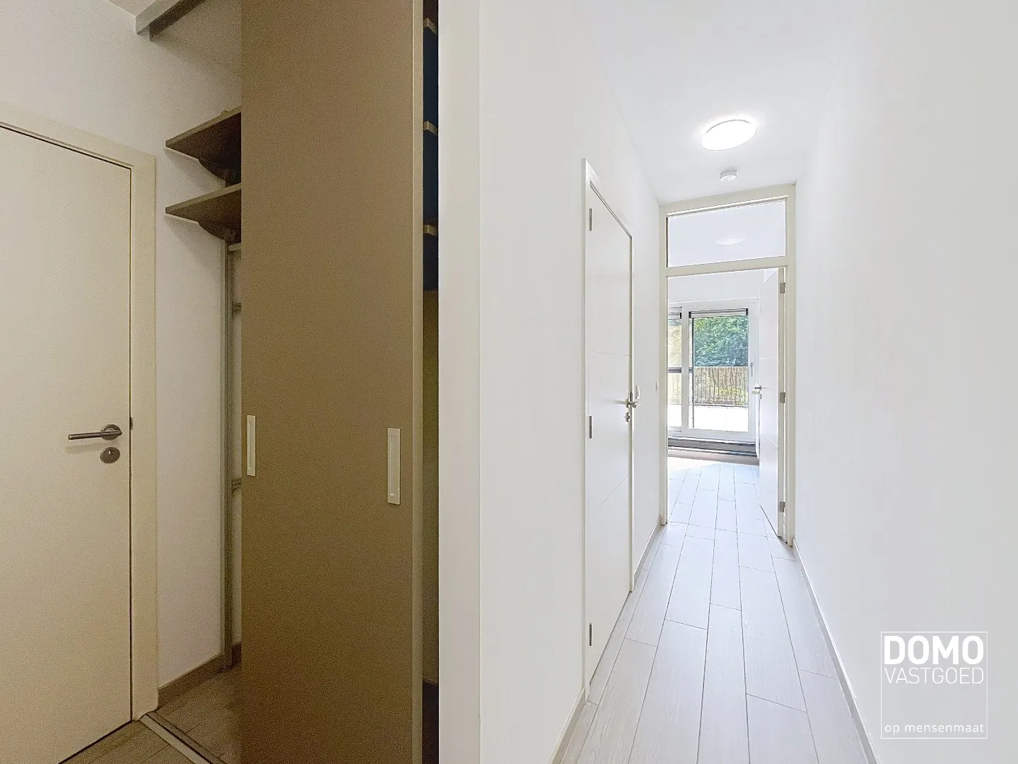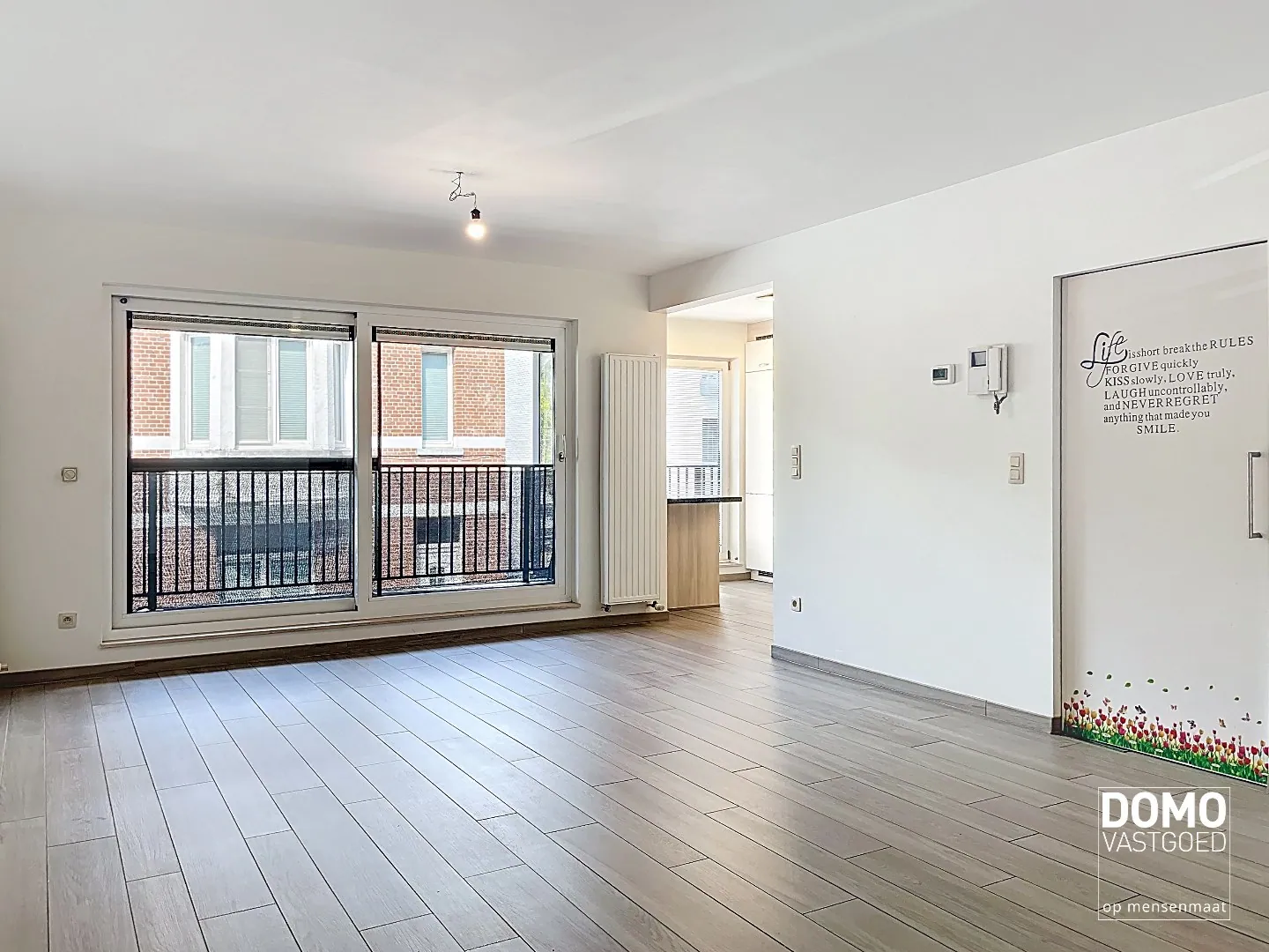 Het appartement bevindt zich op de eerste verdieping en heeft een bewoonbare oppervlakte van 86m². De leefruimte is lichtrijk en sluit mooi aan op de open, volledig uitgeruste keuken. Aan de voorzijde van het appartement bevindt zich een balkon en aan de achterzijde een zeer ruim terras.