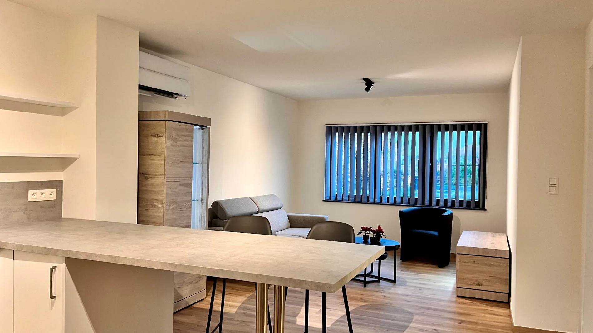 Dit appartement is volledig geschilderd en voorzien van raamdecoratie, verlichtingsarmaturen, airco, zonnepanelen, meubilair, tv, stofzuiger, keukenuitrusting,....
