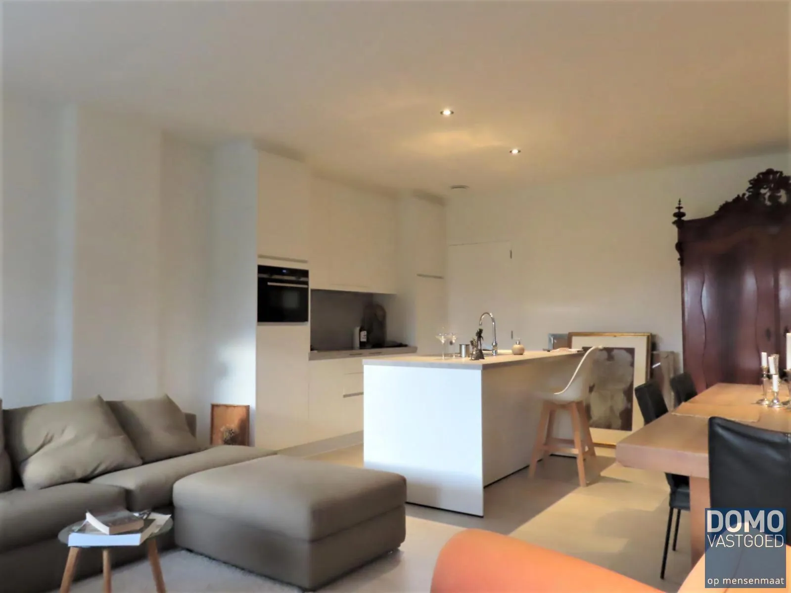 Een prachtige woonkamer met veel lichtinval door de grote raampartijen. Een open keuken die compleet uitgerust is met alle hedendaagse toestellen zoals een inductie kookplaat, vaatwas, koelkast met vriesvak, enz... Aan de keuken bevindt zich nog een berging/wasplaats.