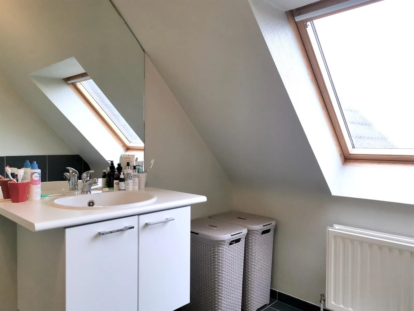 op de bovenverdieping is er een badkamer (lavabo/bad) en 2 slaapkamers waarvan 1 van 24m². Tevens is er op deze verdieping ook nog een wasplaats/bergruimte aanwezig.
