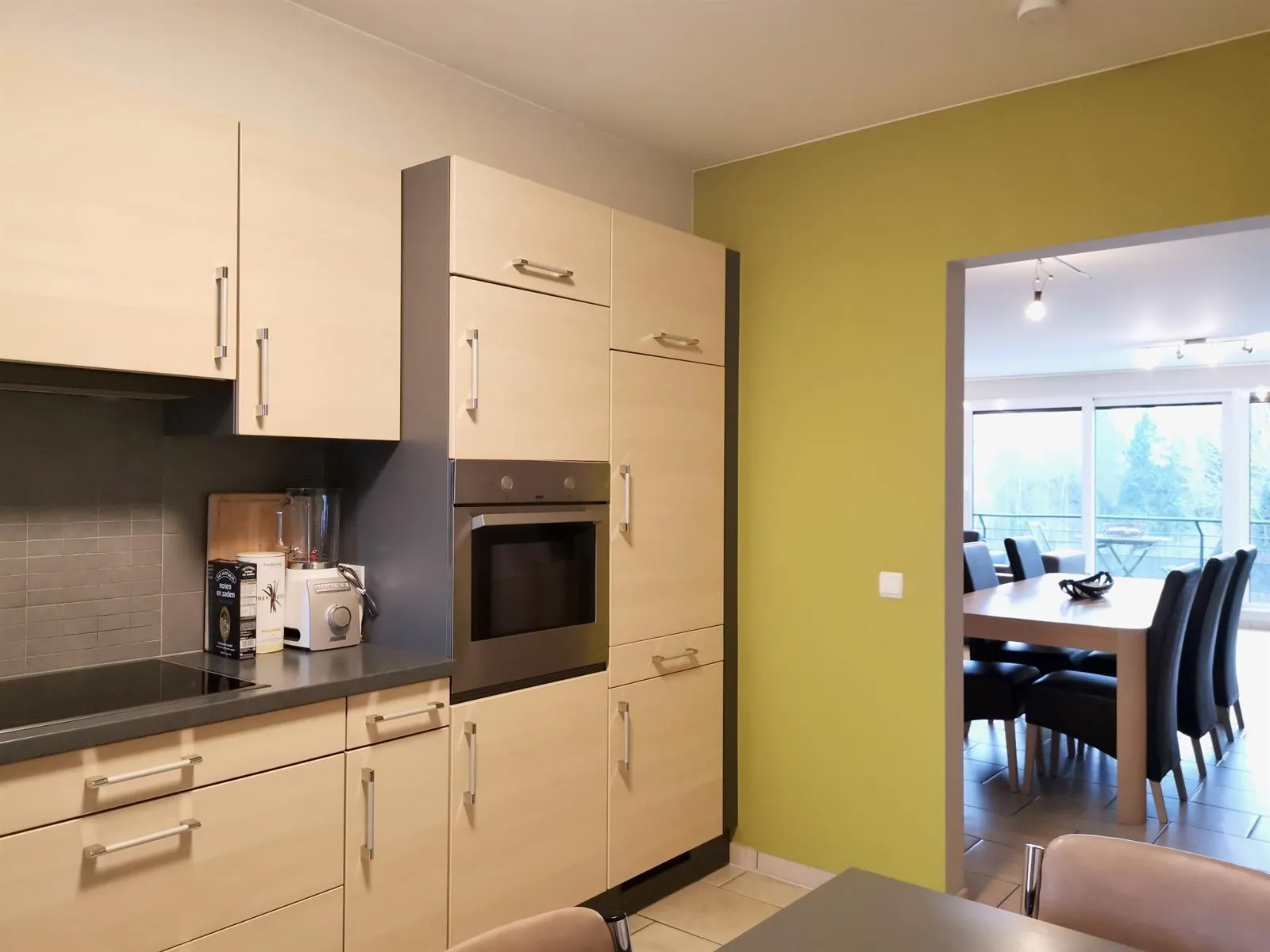 We komen het appartement binnen in de ruime inkomhal dewelke rechtstreeks toegang geeft tot zowel het gastentoilet, berging/bureelruimte en de ruime eetkamer met aangrenzende leefruimte waar het vele lichtinval de grootste troef is. Vanuit de eetkamer/leefruimte kan men naar de ruime keuken gaan waar er eveneens plaats is voor een ontbijttafel. De keuken is volledig uitgerust met alle nodige toestellen.