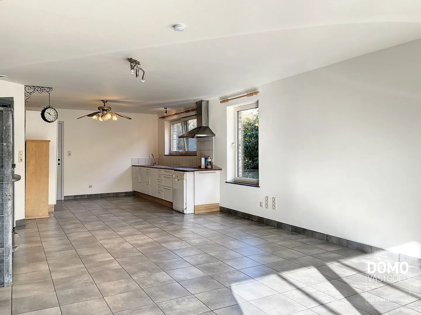 De woonkamer is ruim en licht, met grote ramen die veel natuurlijk licht binnenlaten. De open keuken biedt voldoende werkruimte voor het bereiden van maaltijden.