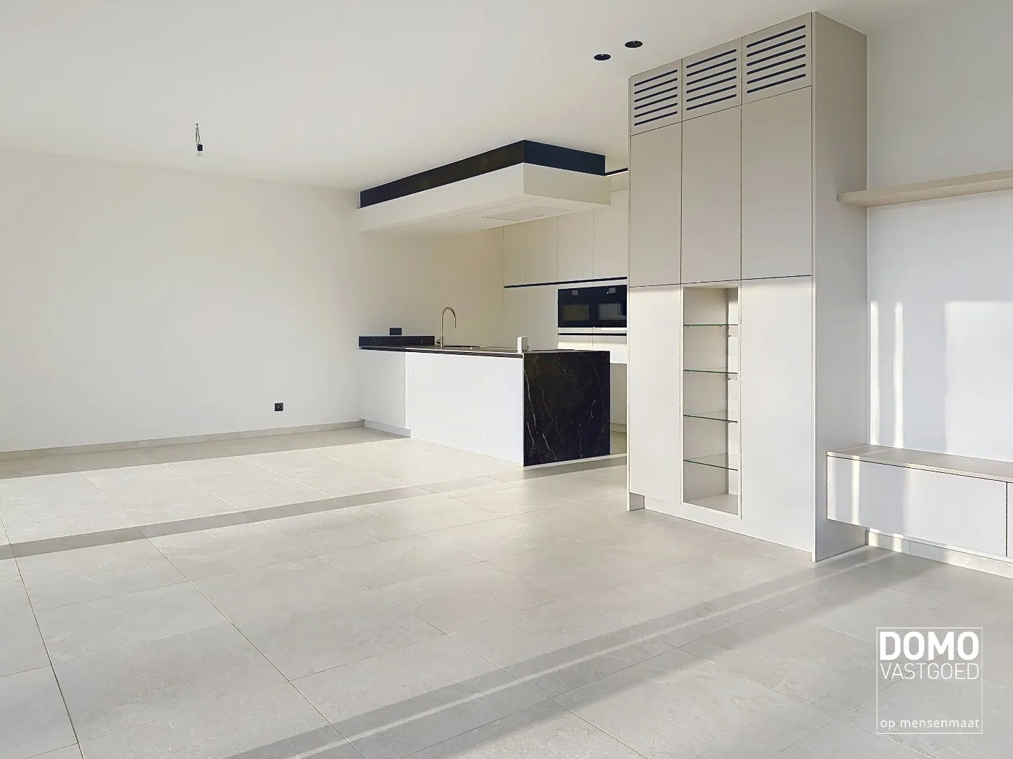 Van zodra je binnenkomt, voel je de ruimtelijkheid en het licht. De royale inkomhal met vestiaire zet meteen de toon, terwijl de lichtrijke leefruimte met grote raampartijen een warme, open sfeer creëert.