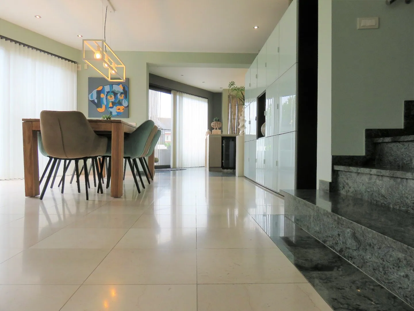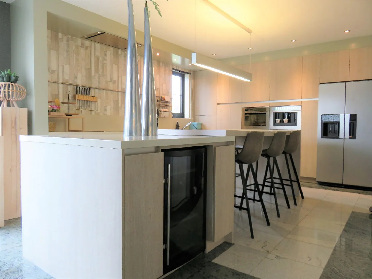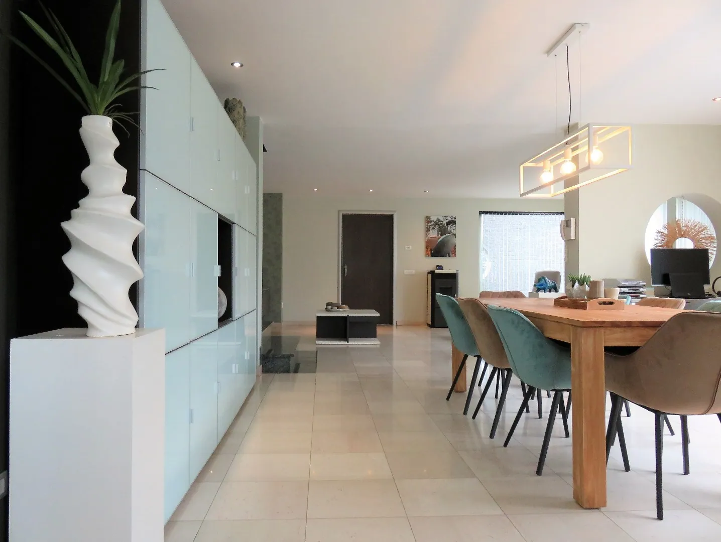 Via de inkomhal met gastentoilet betreden we de open leefruimte vanwaar we verder gaan naar een recent moderne keuken die volledig uitgerust is met alle huidig comfort. Daarbij is er een wasplaats en berging aangrenzend aan de keuken. Vanuit de wasplaats kan u eveneens naar de zeer grote garage waar er plaats is voor 2 wagens.