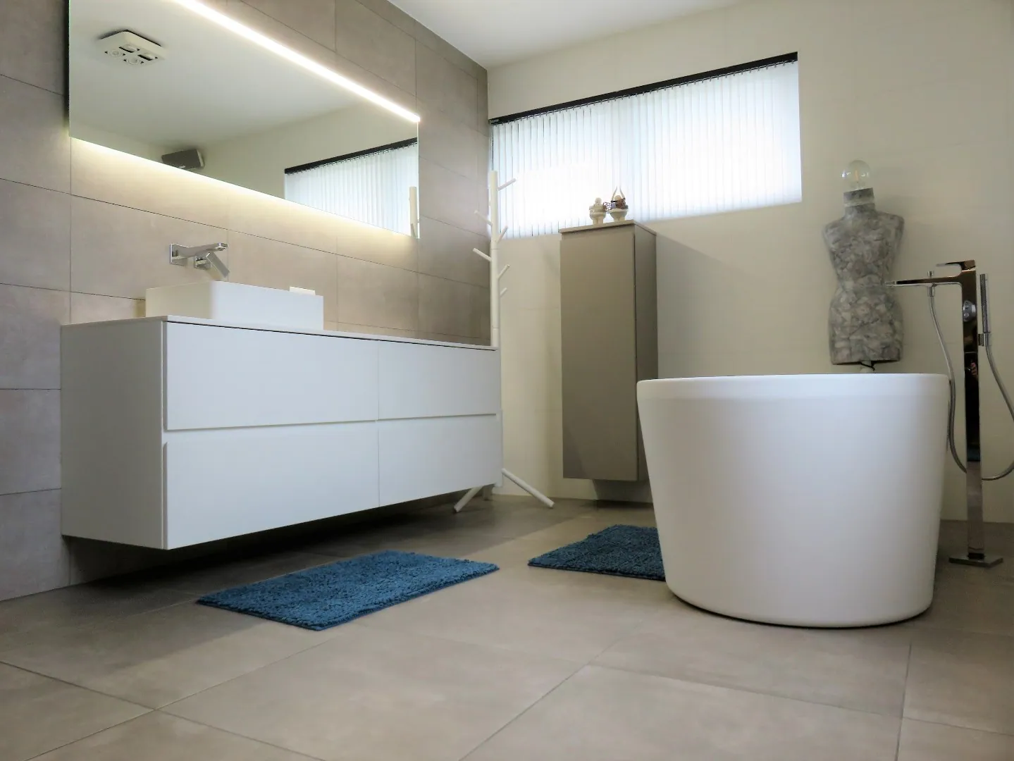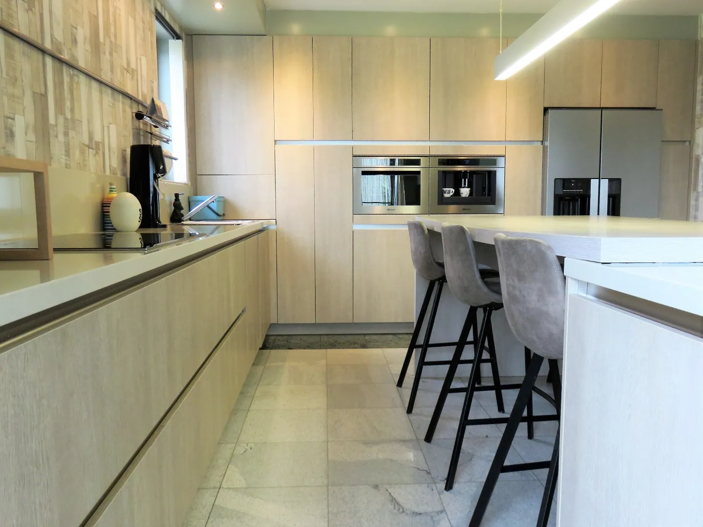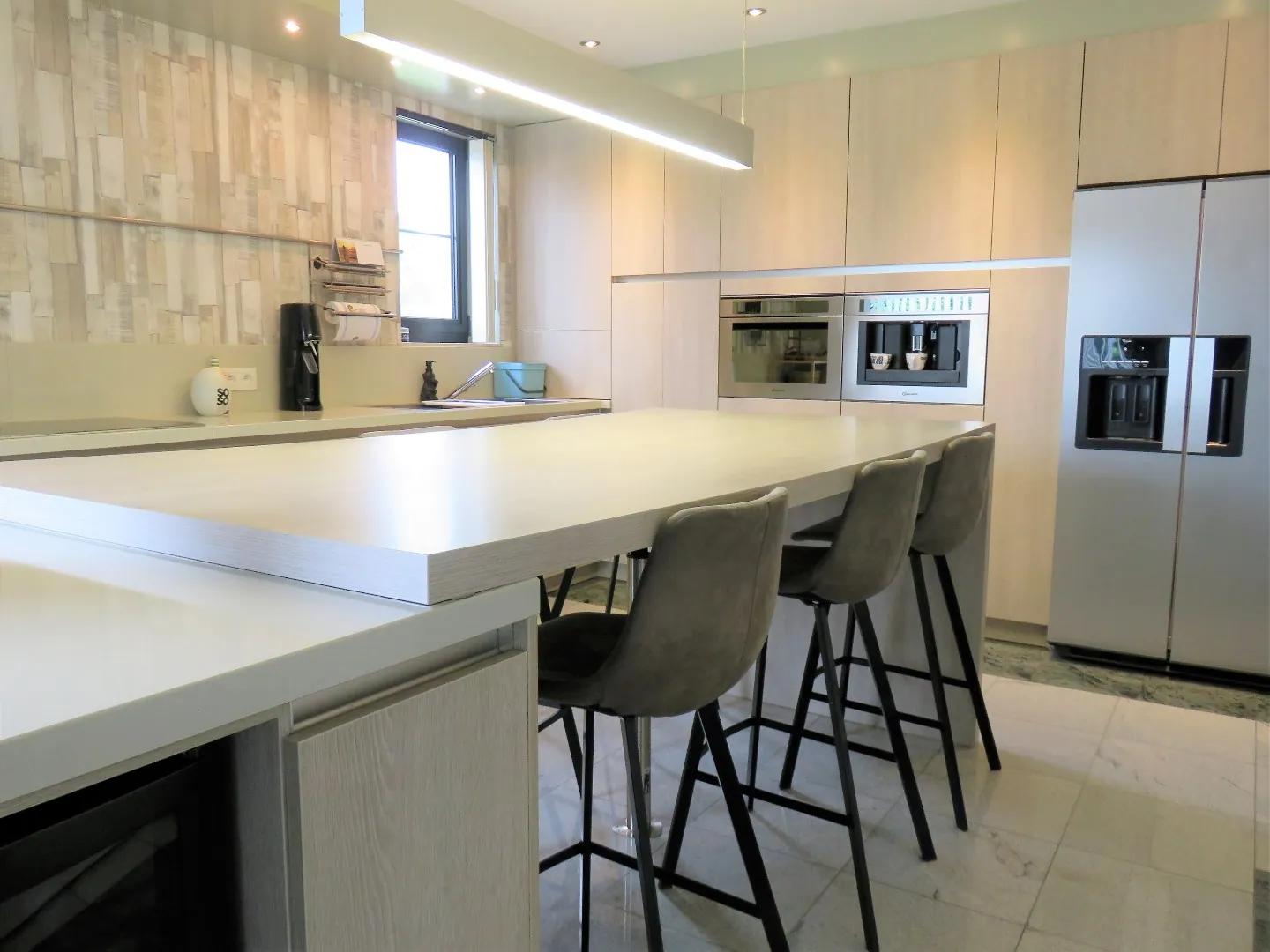 Via de inkomhal met gastentoilet betreden we de open leefruimte vanwaar we verder gaan naar een recent moderne keuken die volledig uitgerust is met alle huidig comfort. Daarbij is er een wasplaats en berging aangrenzend aan de keuken. Vanuit de wasplaats kan u eveneens naar de zeer grote garage waar er plaats is voor 2 wagens.