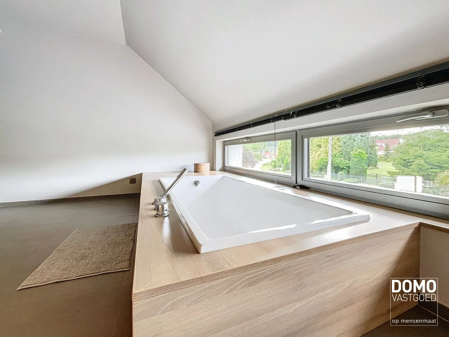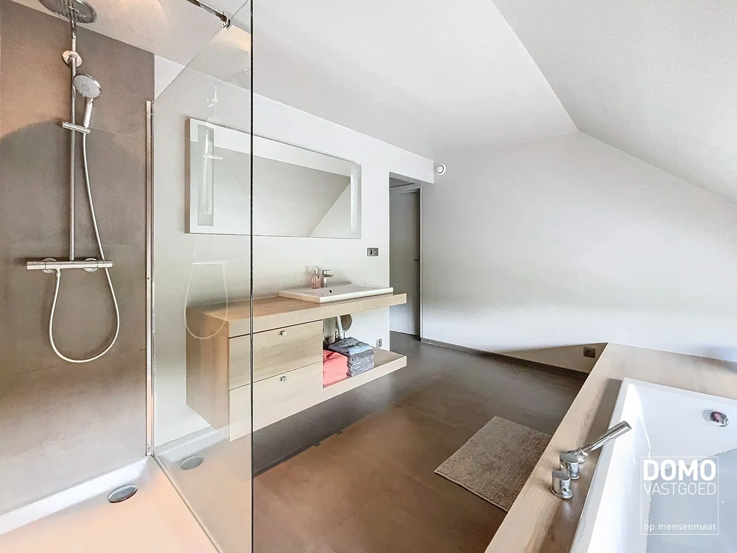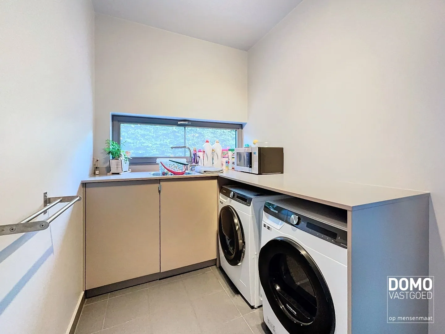 Zowel in de leefruimte als in de keuken heeft u zicht op de tuin. Naast de keuken is er een ruime wasplaats met aparte berging die dan weer direct toegang geeft tot de inpandige garage. Een aparte bureelruimte/slaapkamer vinden we eveneens op de gelijkvloerse verdieping.