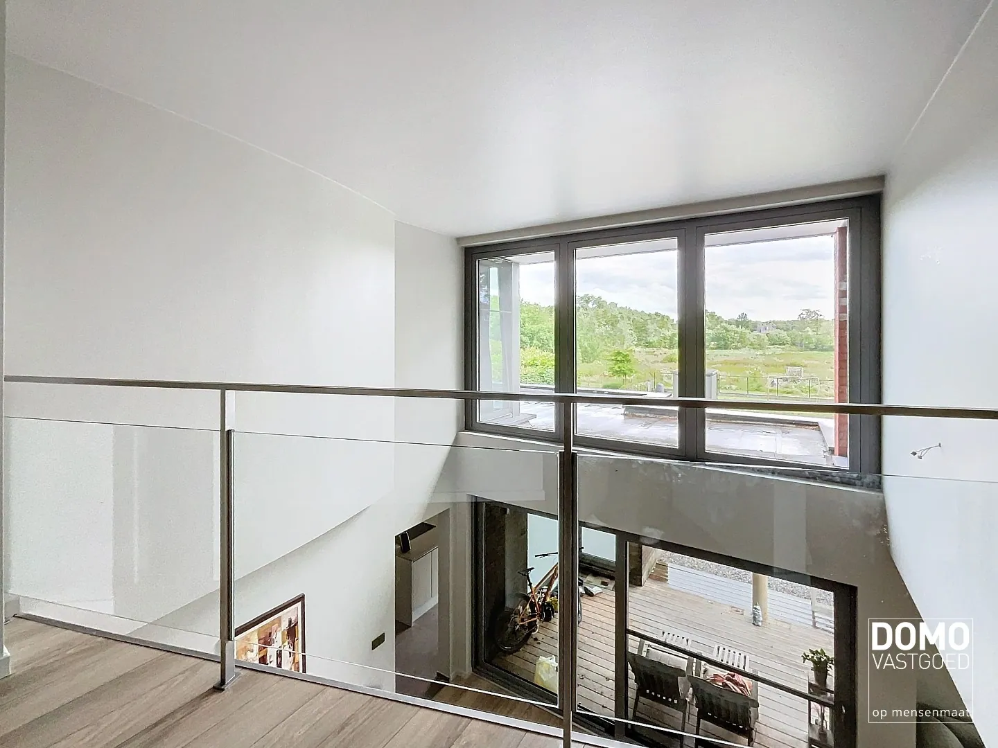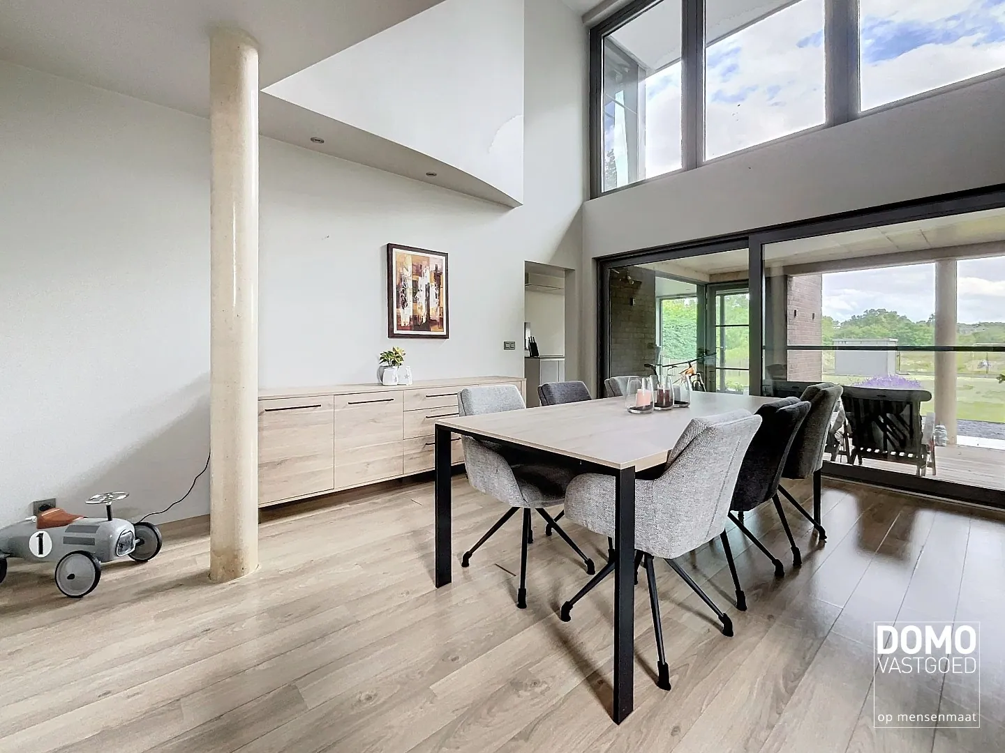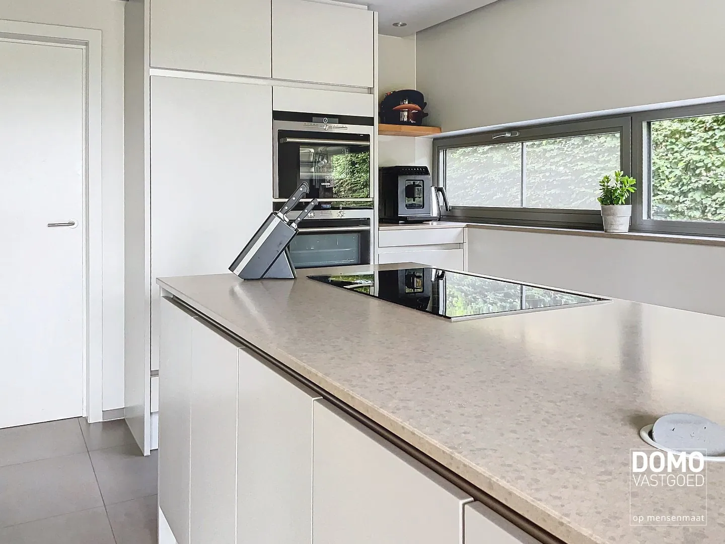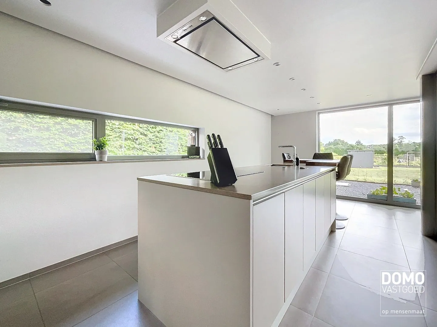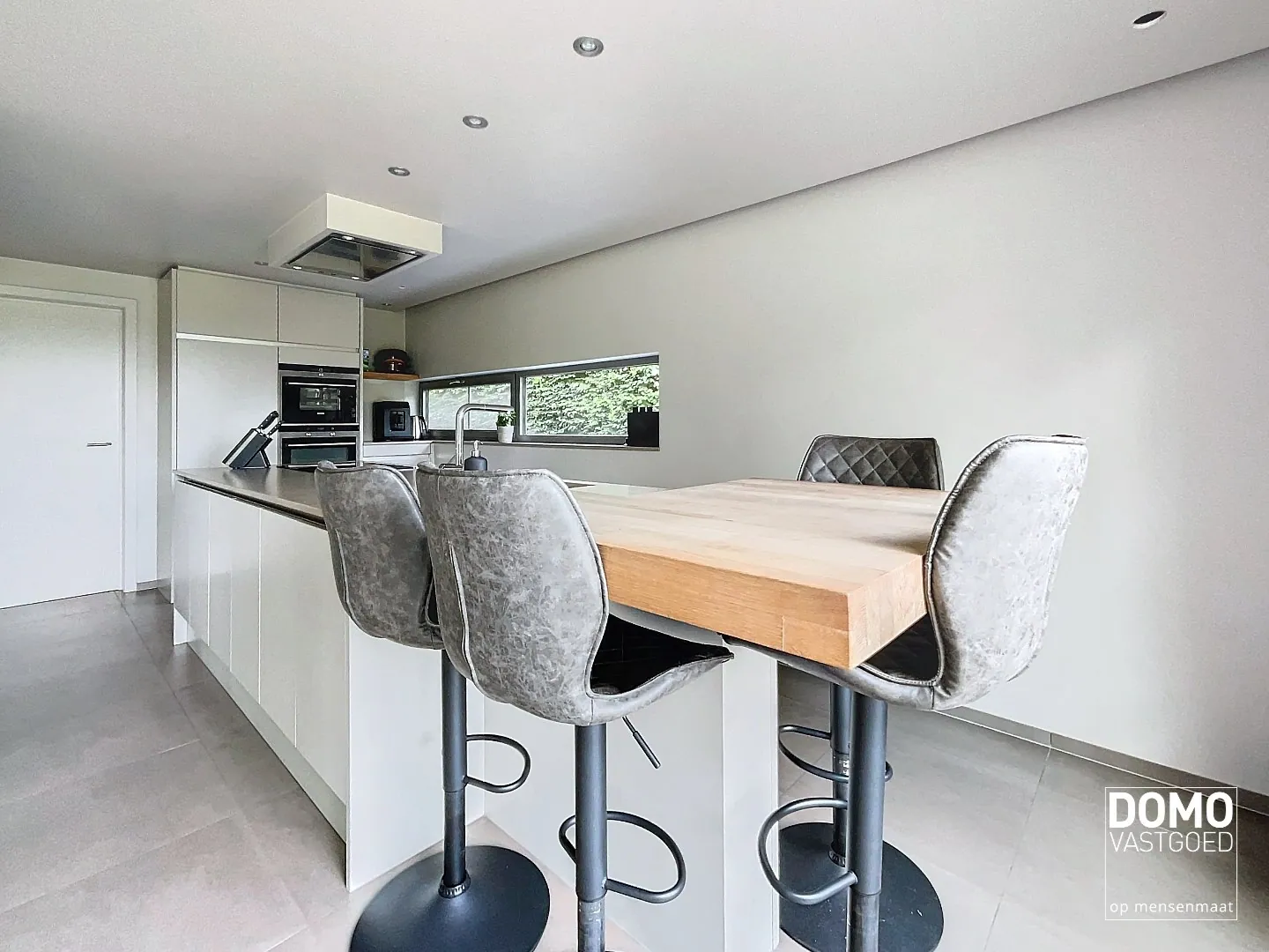 U komt binnen in een ruime inkomhal met vestiaire en gastentoilet. Vervolgens kom je uit in een moderne open leefruimte met hoge plafonds en veel lichtinval. Vervolgens kom je in de moderne keuken die voorzien is van alle nodige, degelijke toestellen (stoomoven, oven, vaatwas, inductiefornuis, koelkast,...) met een gezellige ontbijthoek.