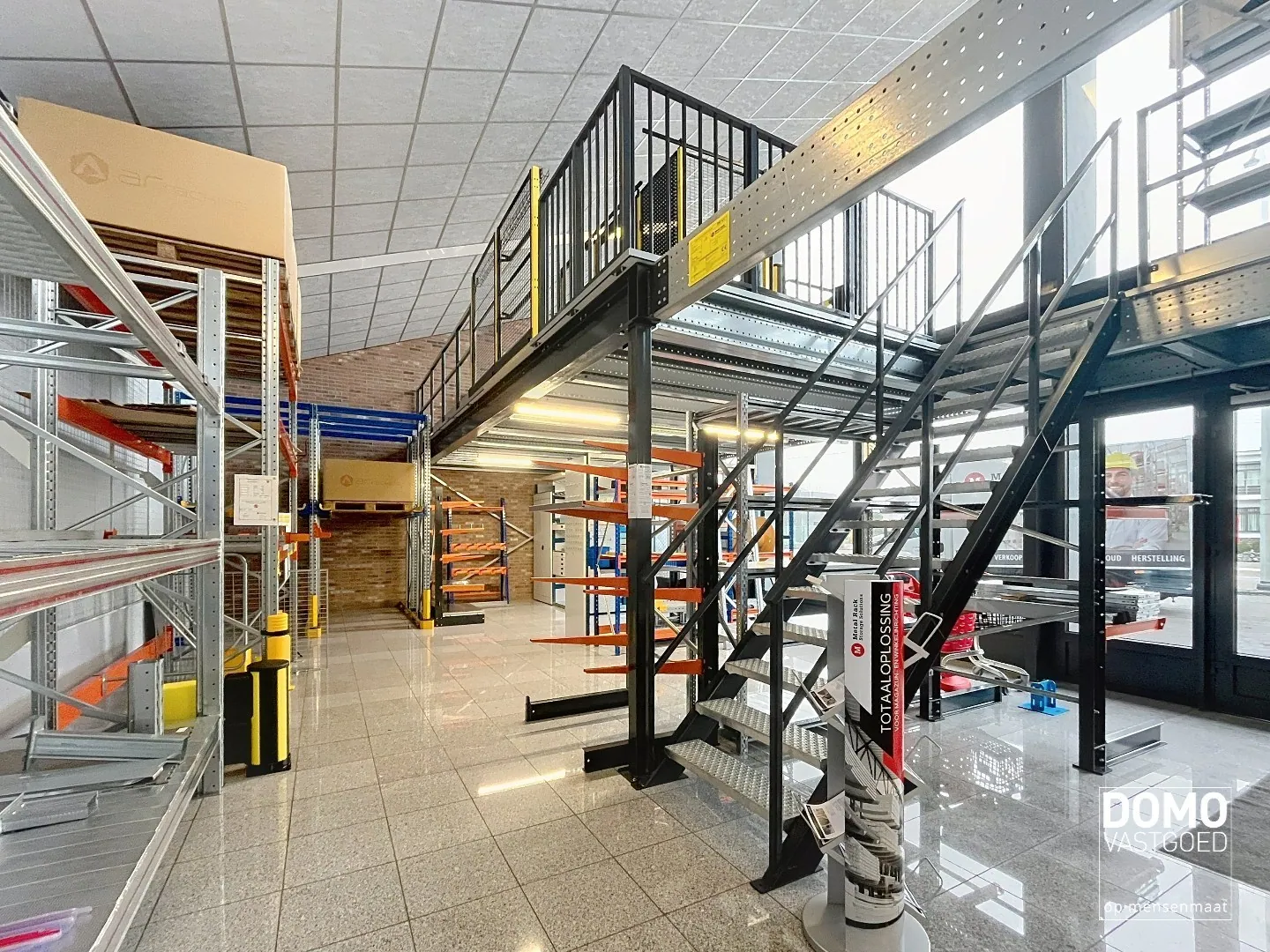 Het gebouw biedt zowel voldoende plaats voor een ruime toonzaal, de plaats voor enkele bureau's en een grote achterliggende opslagplaats.