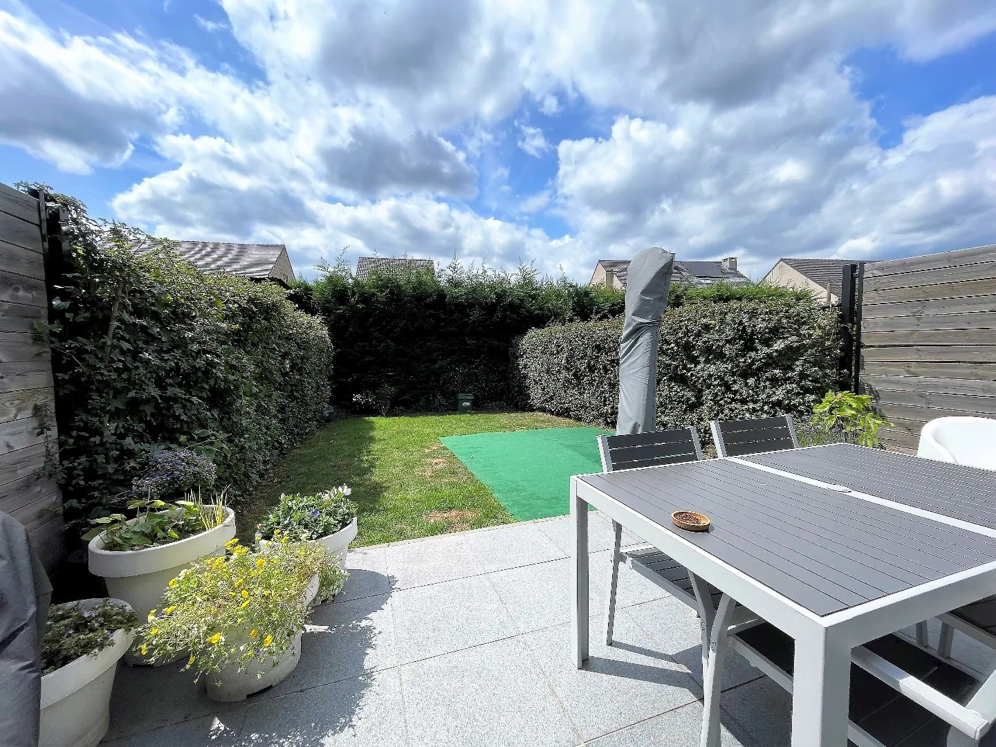 De afgesloten tuin aan de achterzijde van de woning is zorgvuldig aangelegd en biedt voldoende ruimte om te genieten van het buitenleven. Er is ook een terras waar men kan ontspannen en genieten van de zon. Parkeren is geen probleem, want er zijn twee ondergrondse parkeerplaatsen met een ruime aansluitende ruime berging voorzien. Als extra zijn deze rechtstreeks verbonden met de woning.