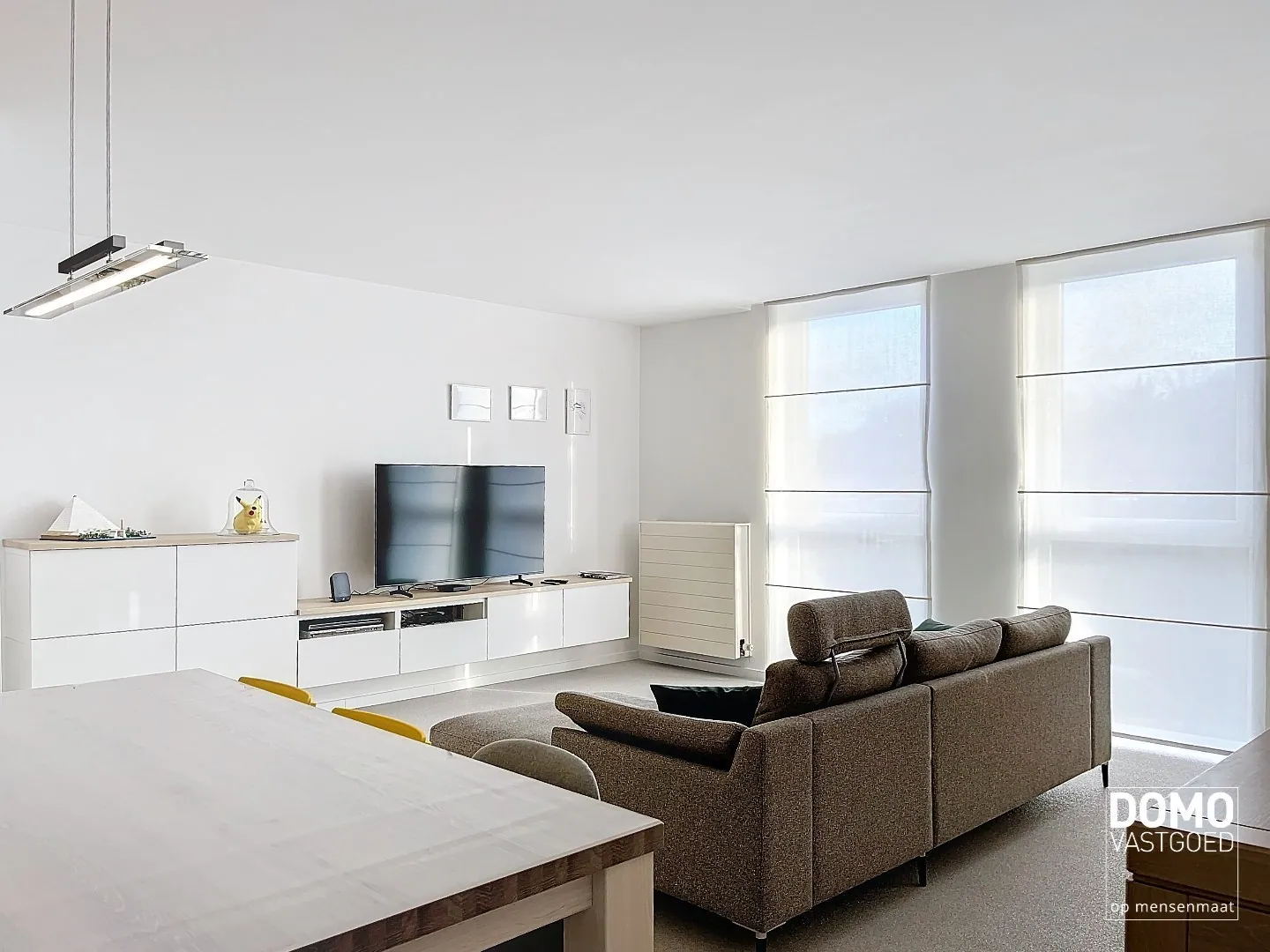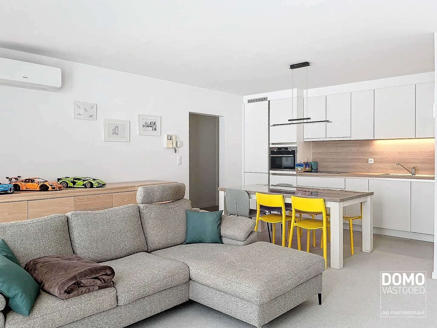 Het appartement is voorzien van een woonkamer met open keuken die voorzien is van de nodige apparaten zoals een combi-oven, afwasmachine, kookplaat...