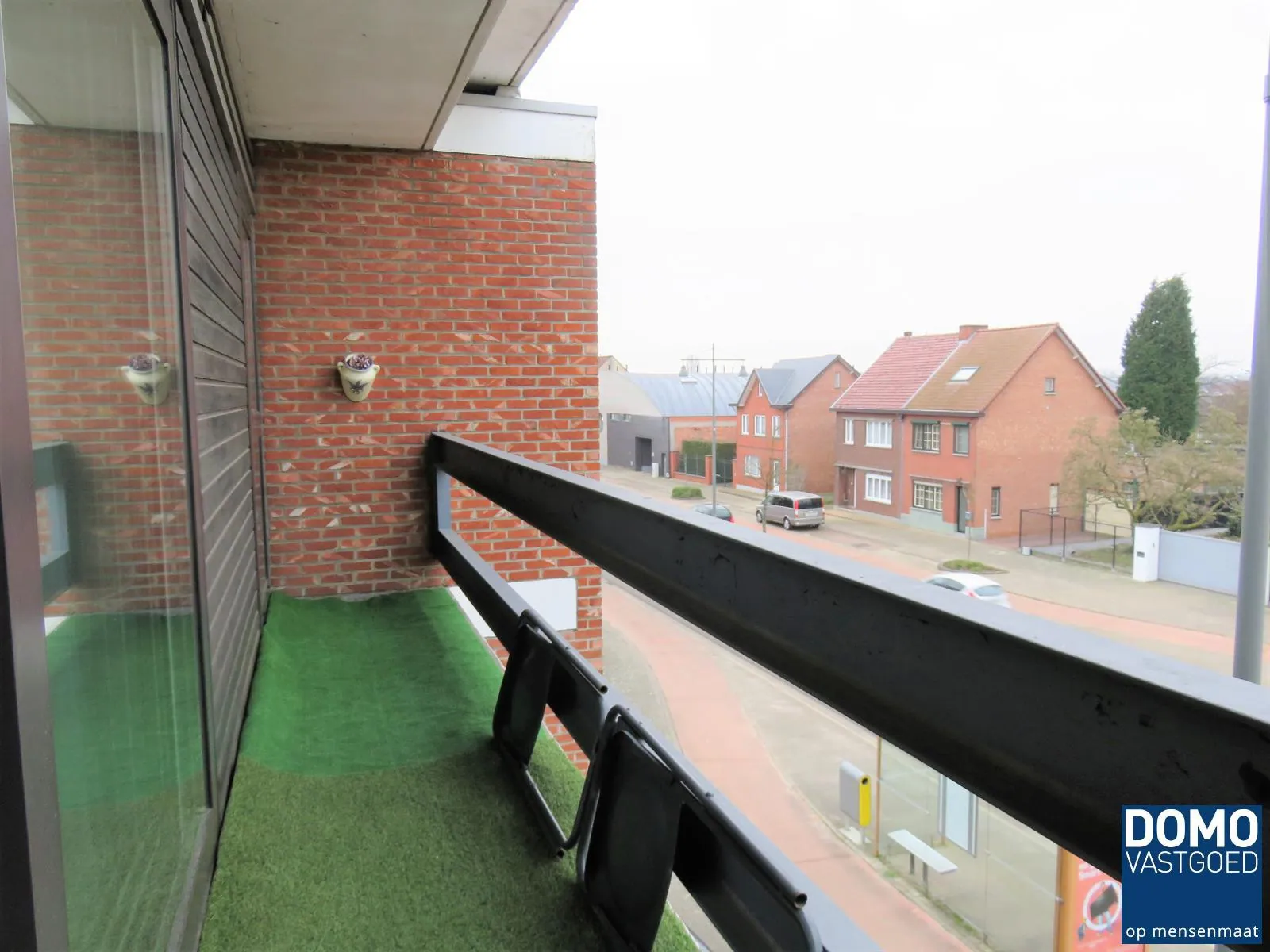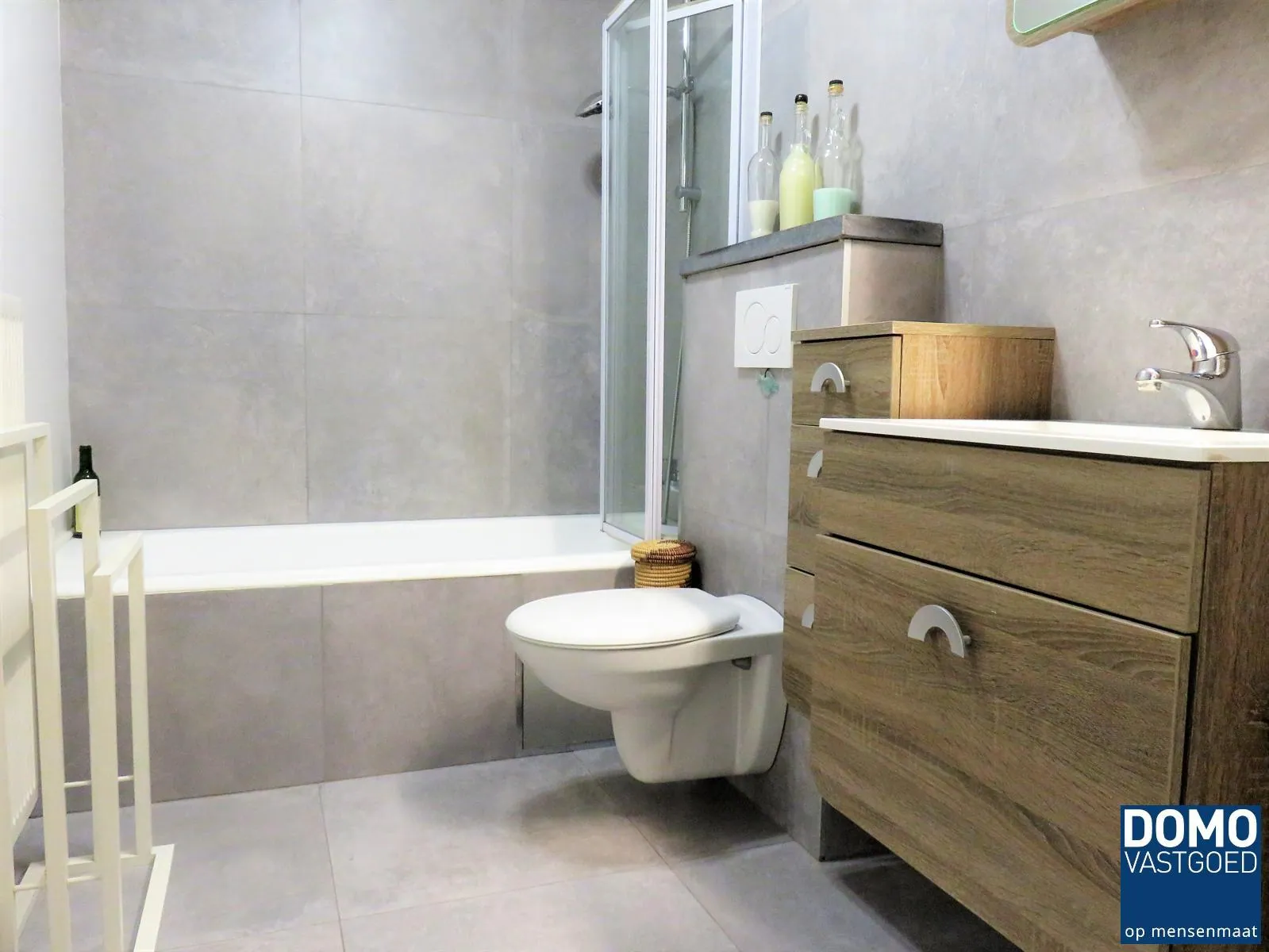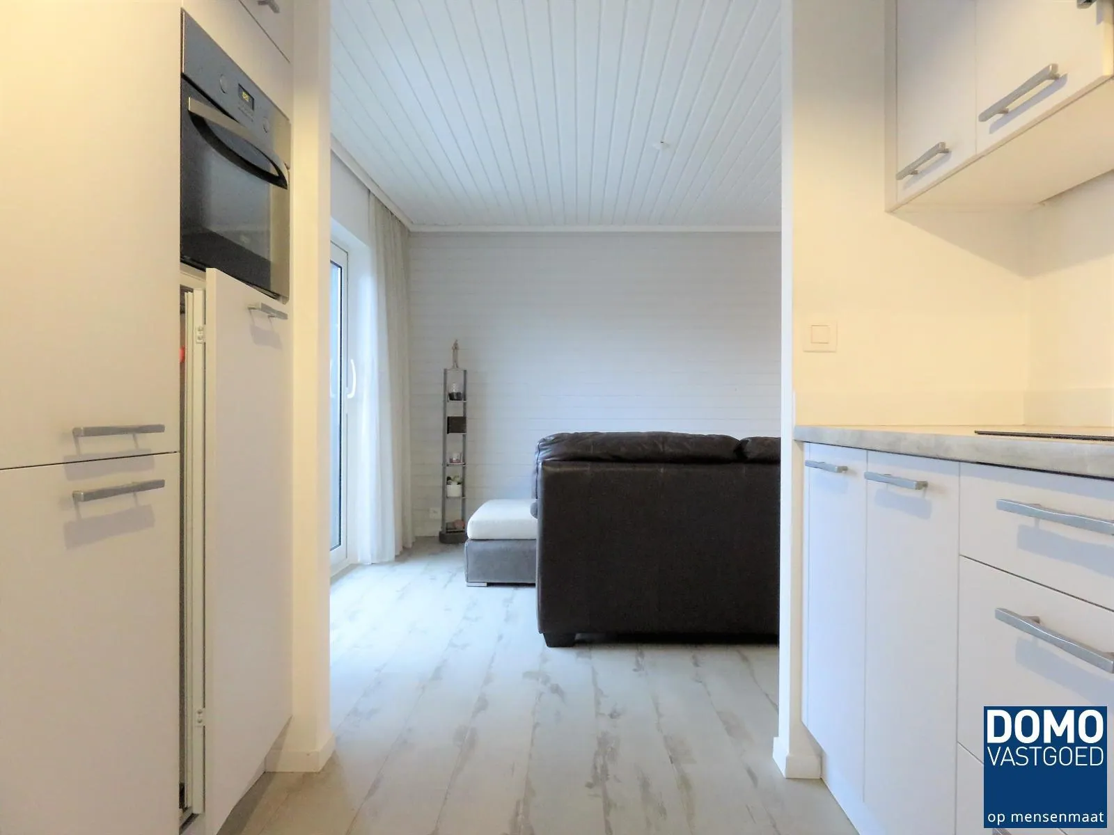 Men komt binnen in de inkomhal met aan de rechterzijde de bergruimte/wasplaats met inbouwkasten. De lichtrijke woonkamer met aansluitende open keuken is gelegen aan de voorzijde van het appartement. via een schuifraam kan u op het knus terras aan de voorzijde.