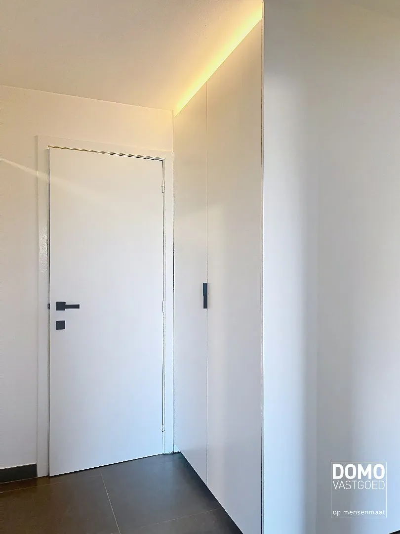 Binnen vind je een ruime leefruimte, keuken ingericht met toestellen, 2 slaapkamers, badkamer met inloopdouche, hal ingericht met inbouwkasten en apart toilet.