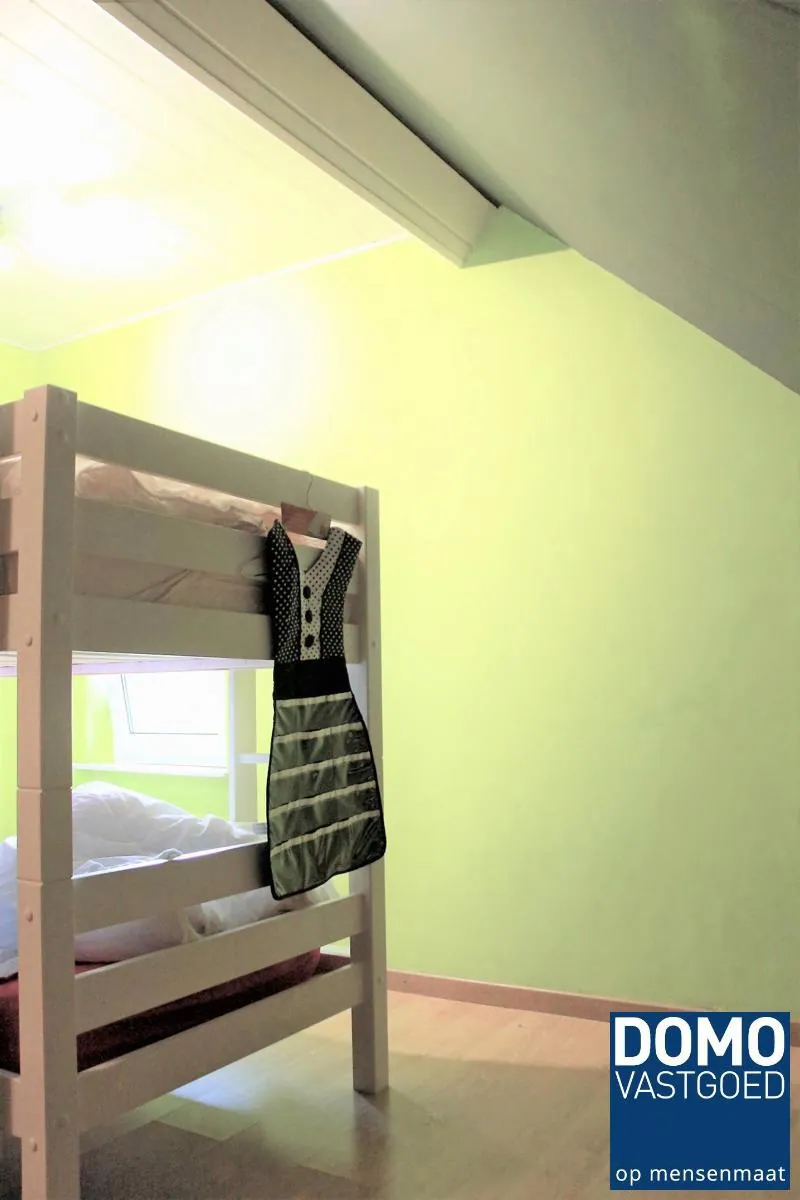 Via een trap in de leefruimte komen we op de eerste verdieping. Hier treffen we een zeer grote en een kleine slaapkamer. Daarbij is er een riante badkamer met bad, douche, lavabo en toilet.