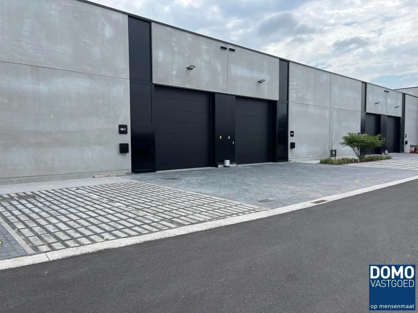 Aan de voorzijde van de unit zijn er twee parkeerplaatsen voorzien. De vrije hoogte van 6m, tevens voorzien van lichtstraat, alsook sectionale poort en aparte inkomdeur.