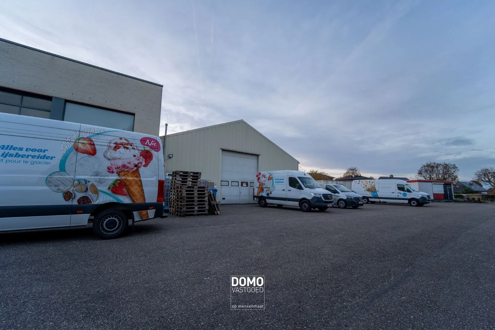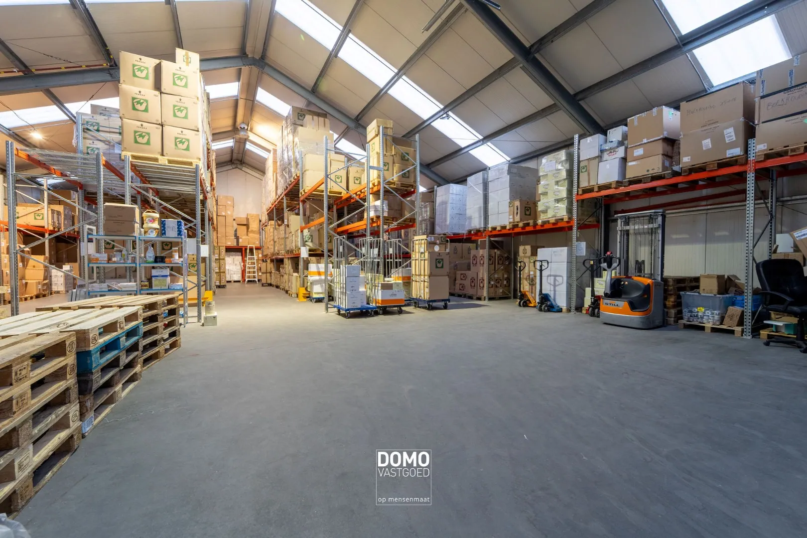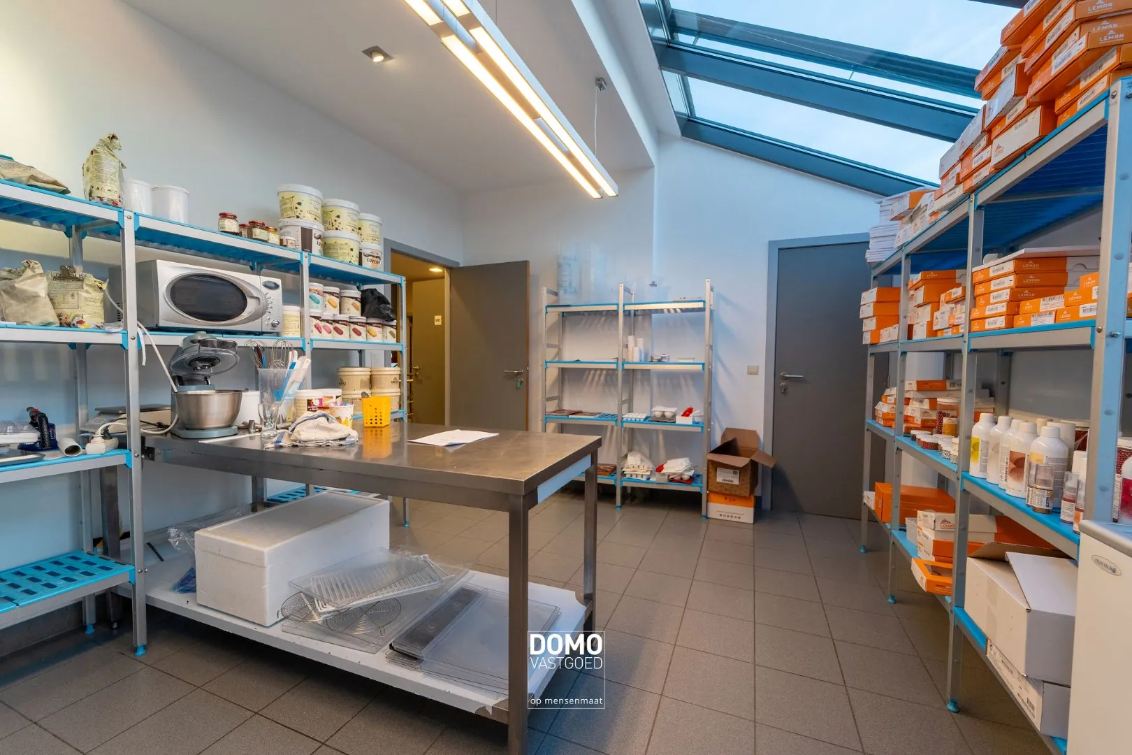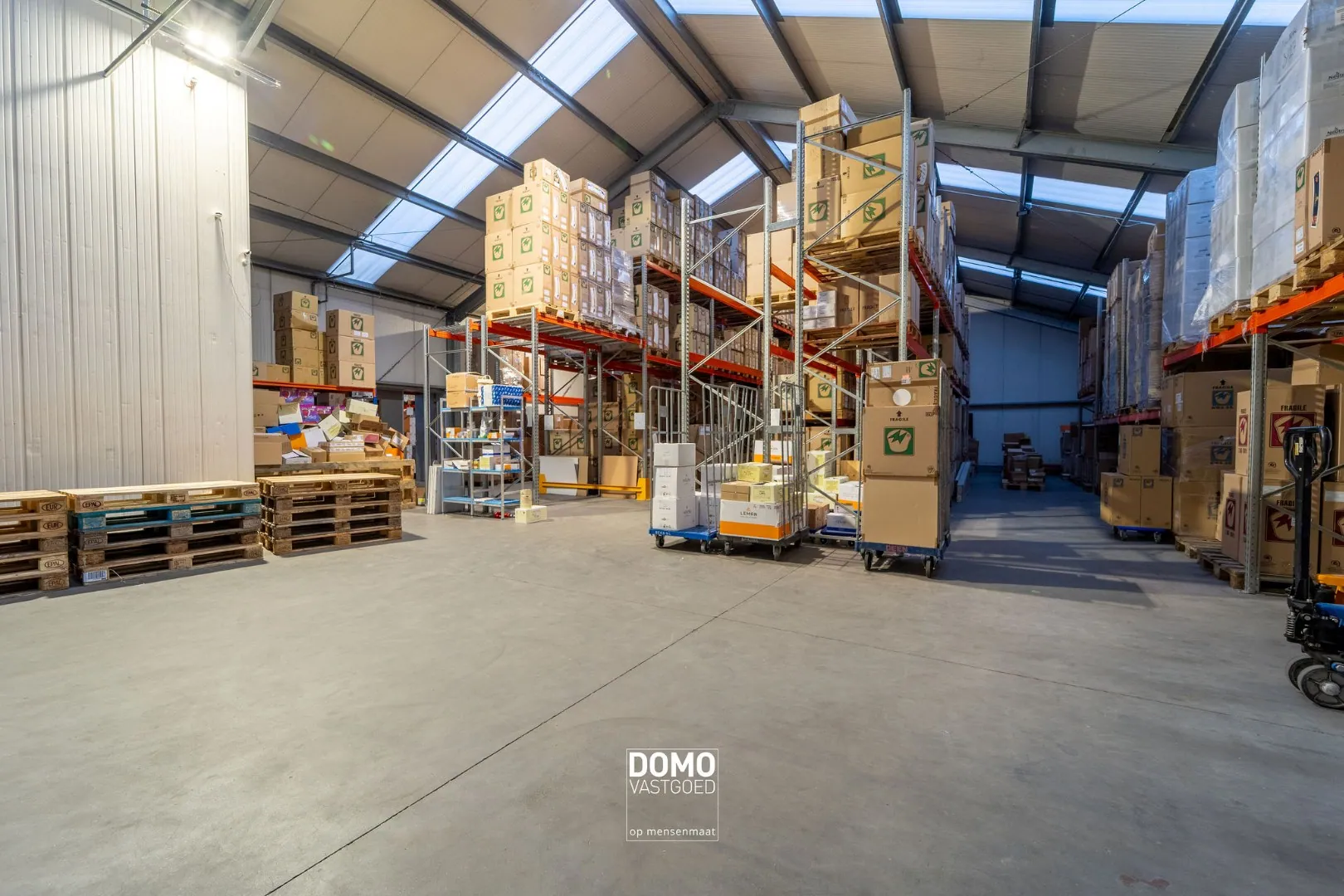 Aansluitend op de showroom ligt een ruime magazijn-productiehal bestaande uit 2 delen met een hoge vrije hoogte en veel natuurlijk licht dankzij de aanwezige lichtstraten. De hal is bijzonder praktisch ingedeeld, waardoor zowel stockage als intern transport vlot georganiseerd kunnen worden. De brede toegangspoort maakt efficiënt laden en lossen mogelijk, zelfs voor grotere voertuigen.