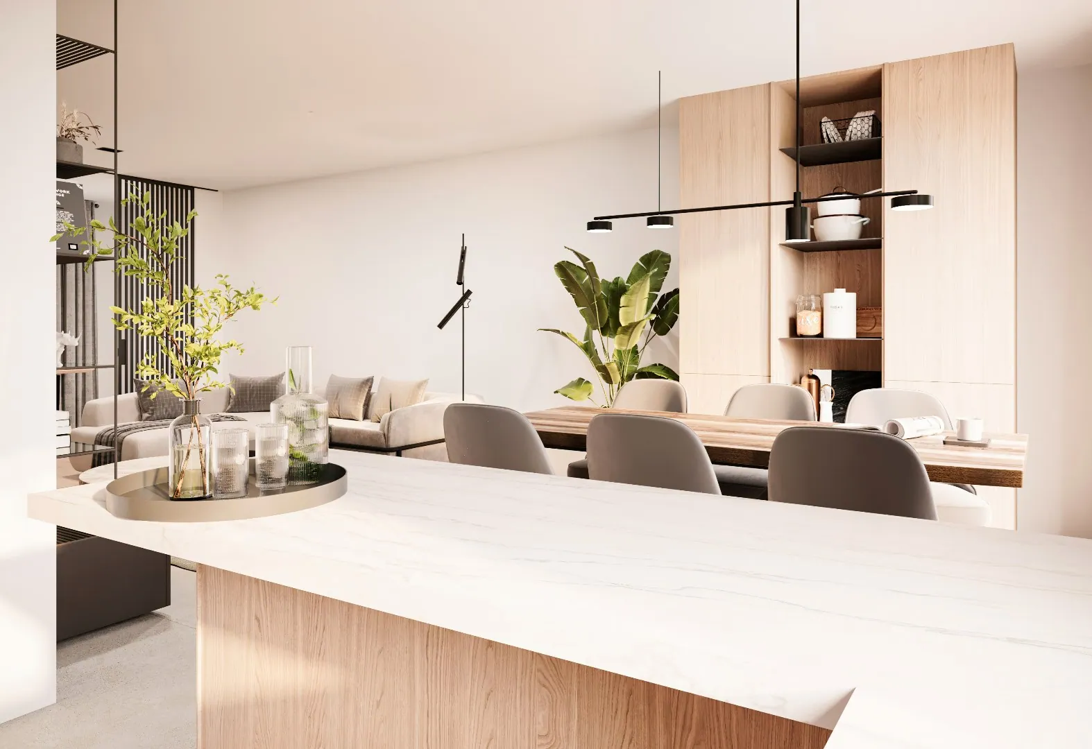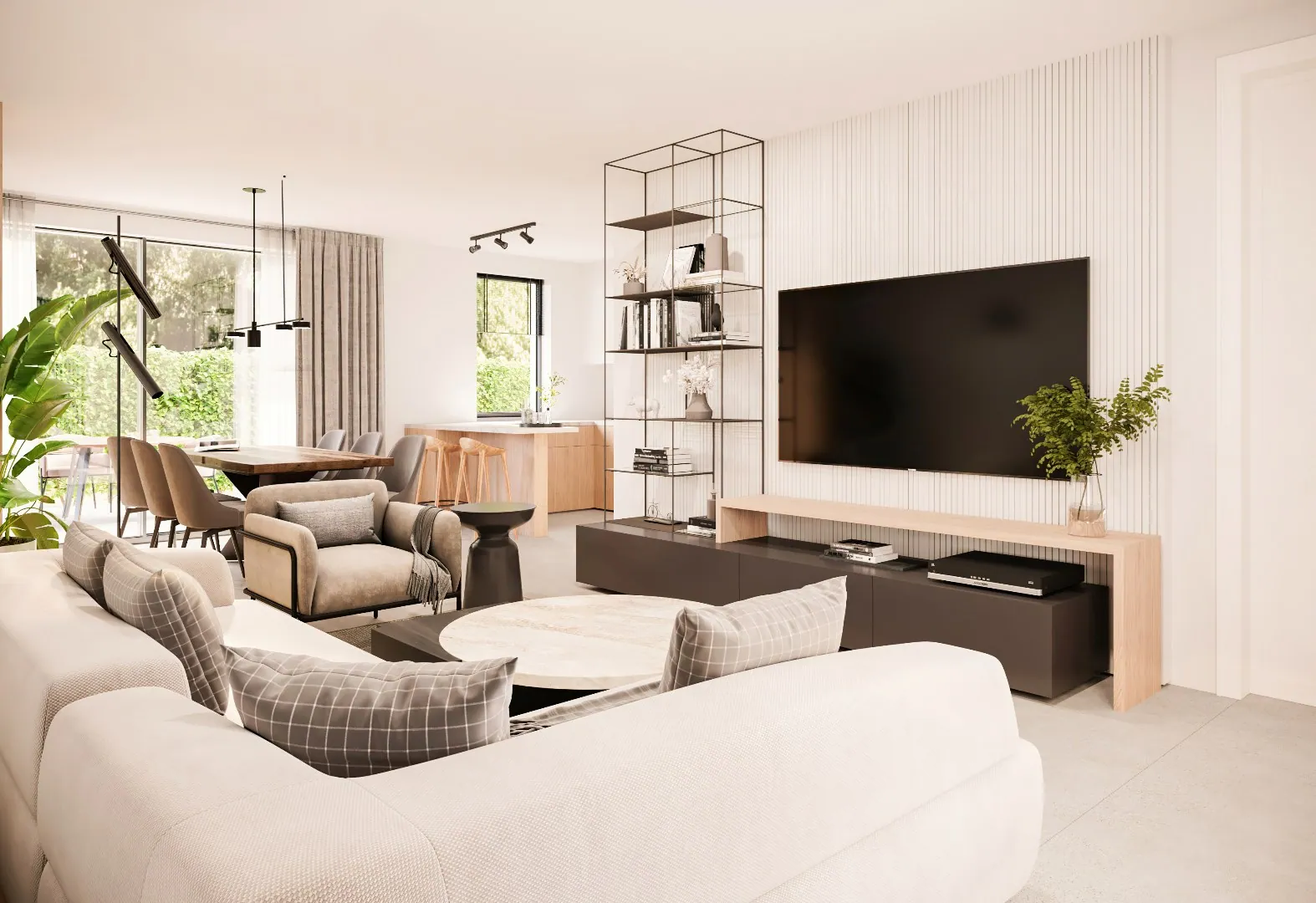 De zithoek, de eethoek en de keuken zijn open en met elkaar verbonden, waardoor er een gevoel van licht en ruimte ontstaat. Aan de voorzijde is er nog een aparte bureelruimte voorzien.
