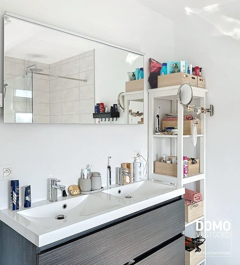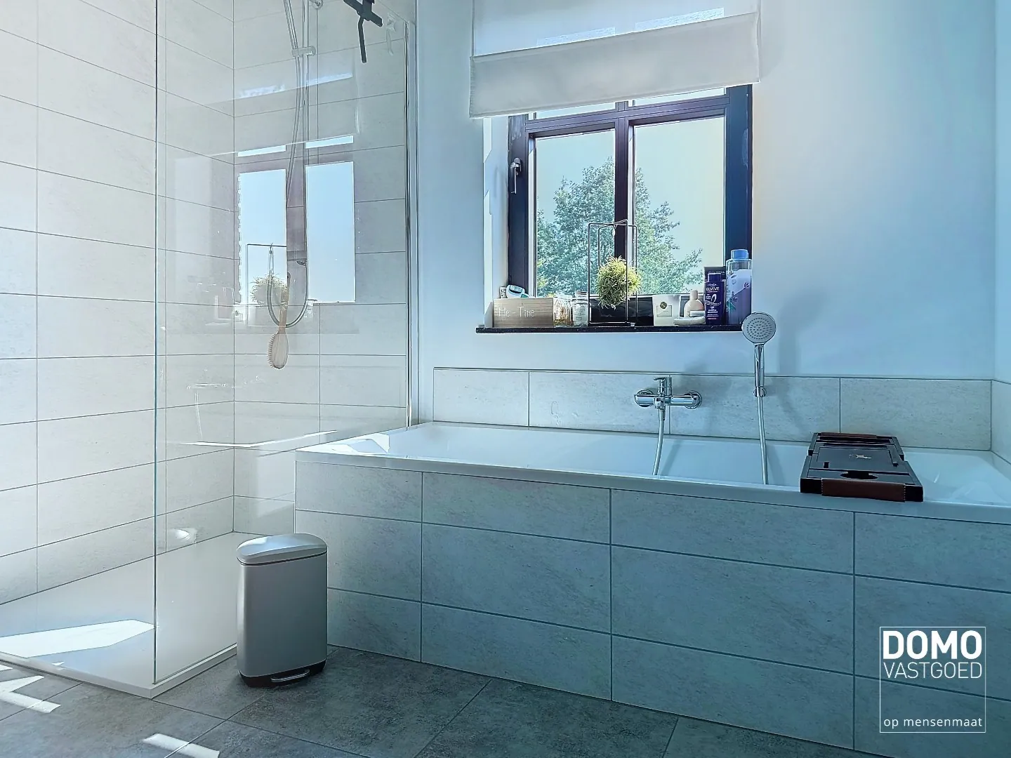 De badkamer is volledig afgewerkt en voorzien van alle moderne gemakken zoals een bad, douche en een dubbele lavabo.