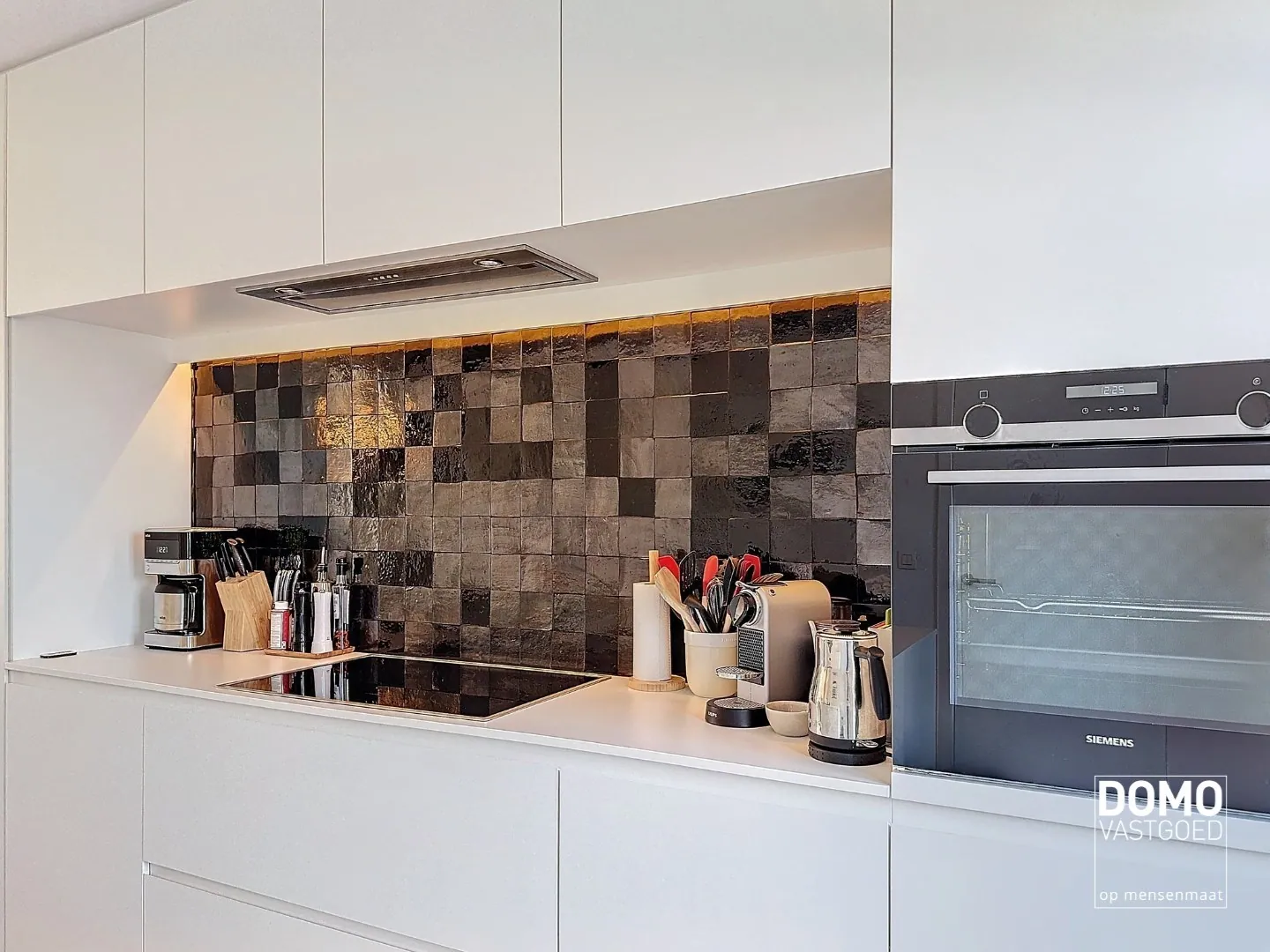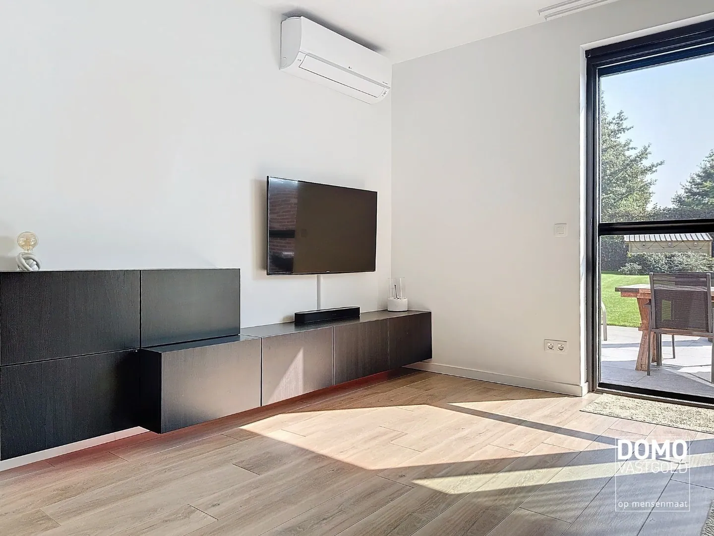 Verder komen wij binnen in de lichtrijke open keuken met aangrenzend de leefruimte, voorzien van airco, die uitkijkt op de tuin en het terras. De tuin is dan ook de ideale plek om te genieten van de zon en rust. Bovendien is deze volledig omheind zodat u kan genieten van volledige privacy.