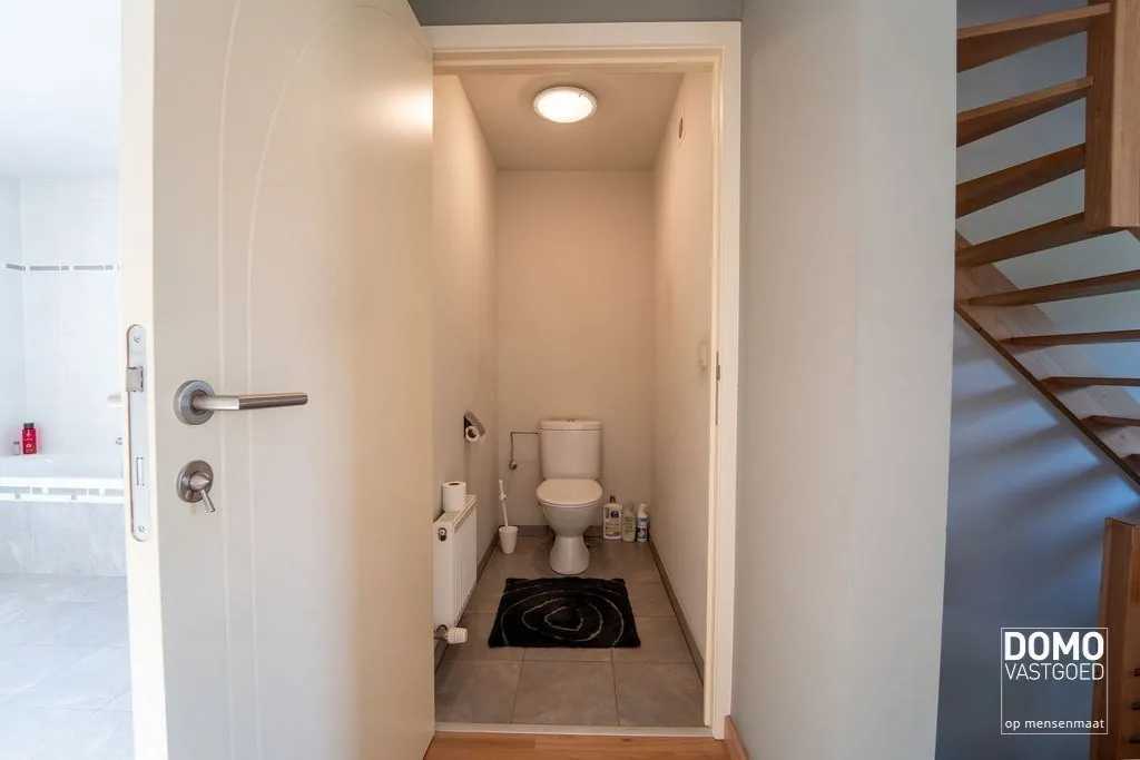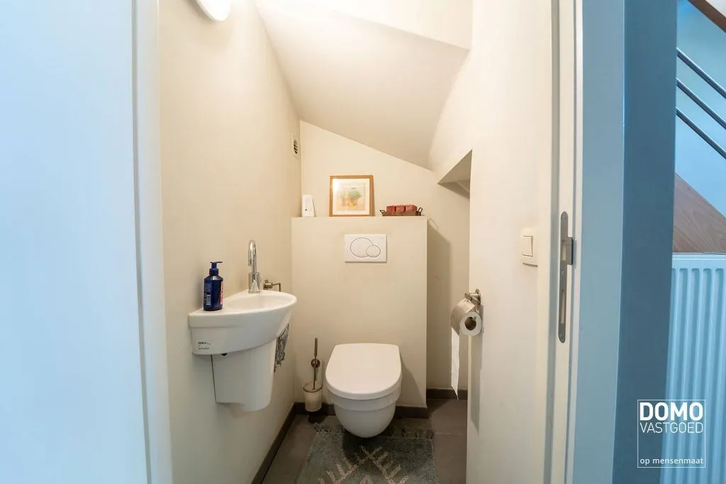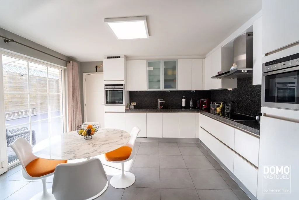 Op het gelijkvloers bevindt zich een aangename leefruimte met open, volledig uitgeruste keuken. Daarnaast is er een wasplaats, een apart toilet, een inpandige garage en een bureau (voorzien van airconditioning) die ook perfect dienst kan doen als extra slaapkamer.