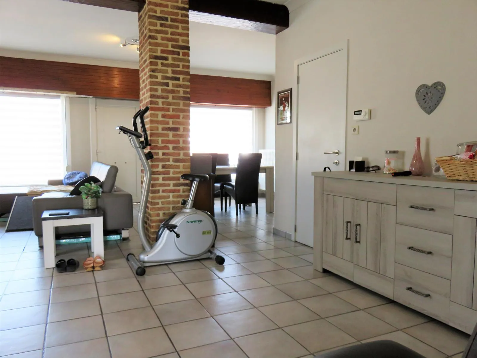 U komt hier direct binnen in de woonkamer (voormalig winkelgedeelte), via een berging is er toegang naar een zeer ruime garage met plaats voor een grote wagen, fietsen en extra opbergruimte aan de achterzijde. Vanuit de woonkamer komen we in een zonnige keuken die uitkijkt op de tuin, aansluitend vinden nog 2 ruimtes die momenteel dienst doen als bureel en hobbykamer.