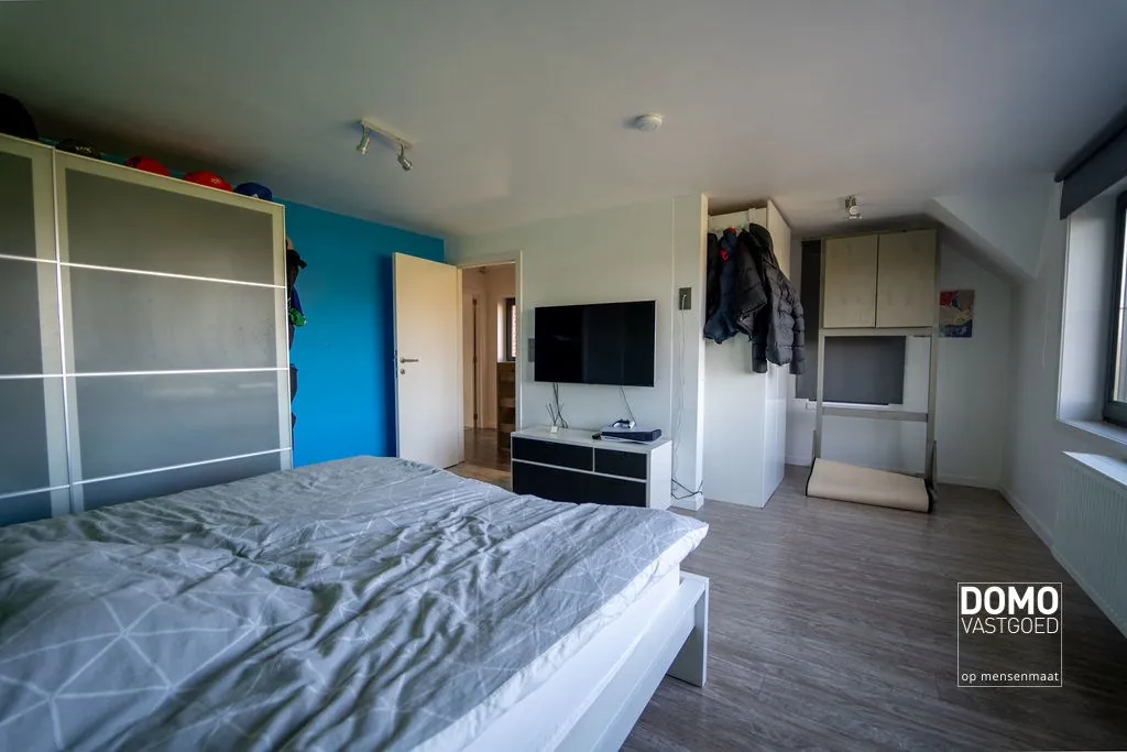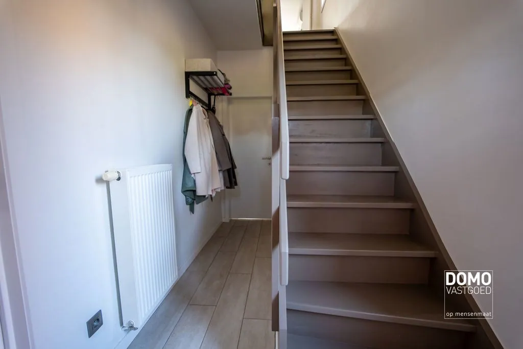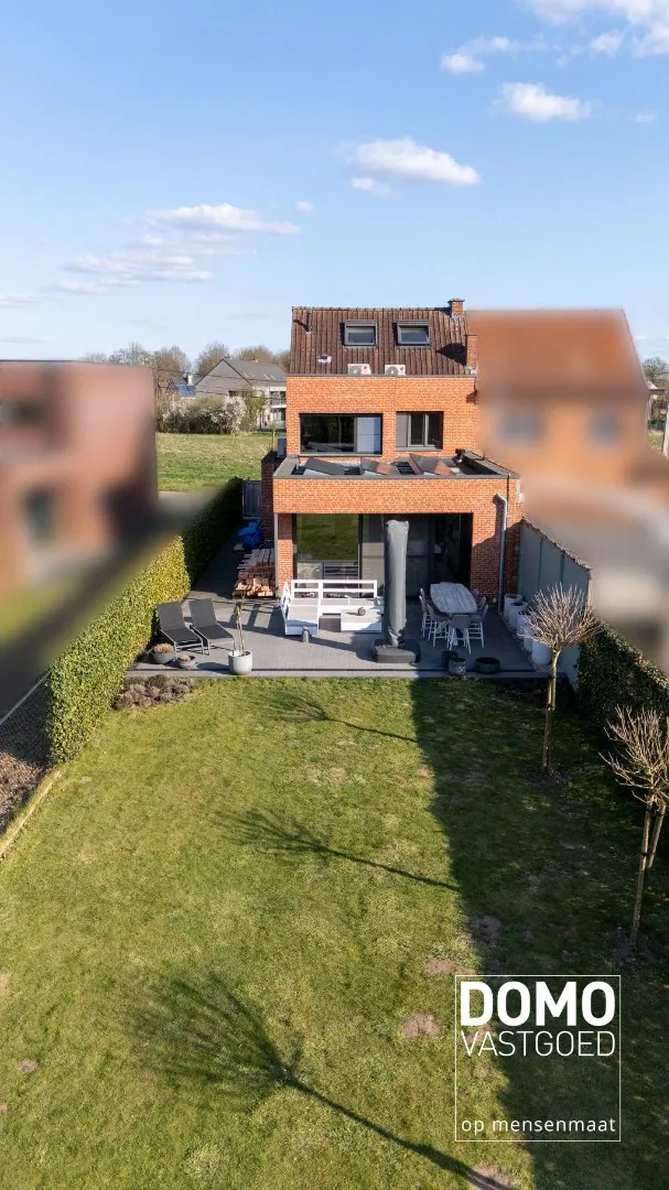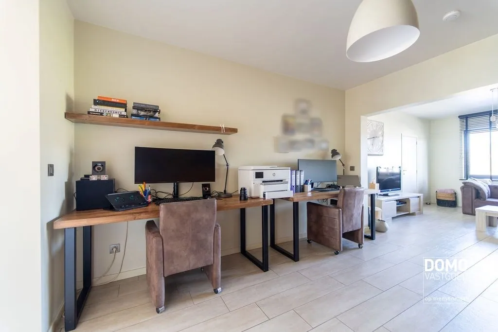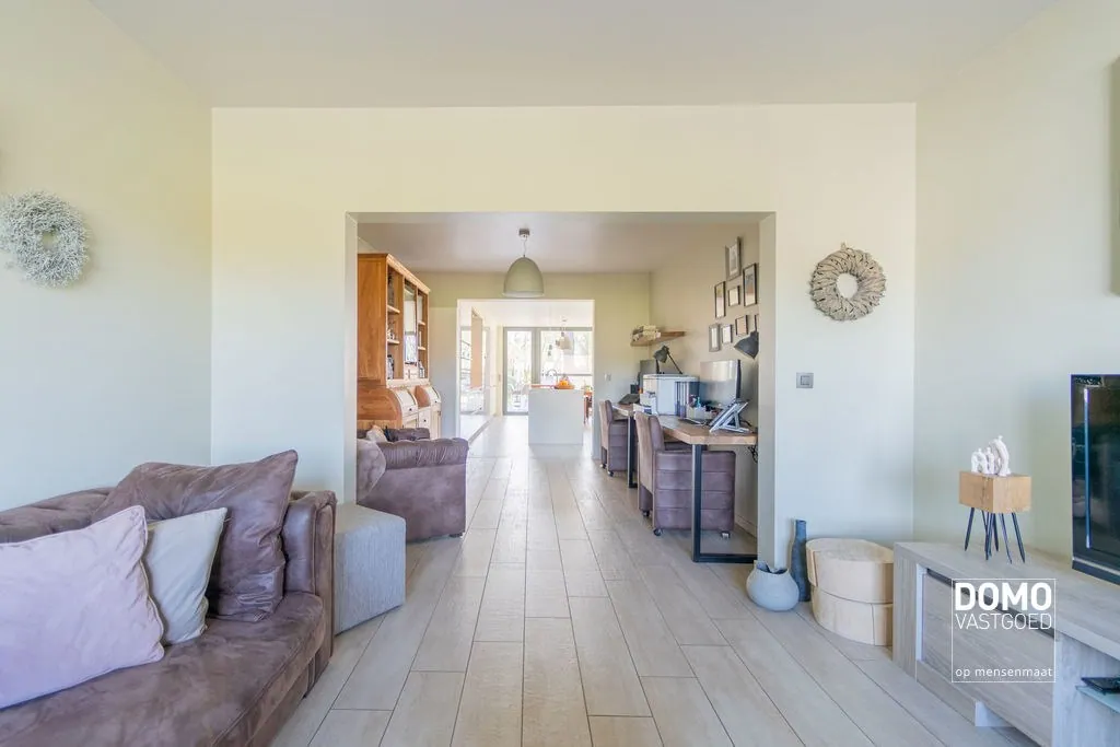 De woning beschikt over een bewoonbare oppervlakte van 234m², verdeeld over drie verdiepingen. Op het gelijkvloers vind je een inkomhal, een gezellige woonkamer, een bureauruimte, een open keuken verbonden met de leefruimte, een apart toilet, een praktische berging én een kelder. Dankzij het grote schuifraam is er veel natuurlijk lichtinval binnen en heb je een directe verbinding met het terras en de tuin – ideaal om te ontspannen of gasten te ontvangen.