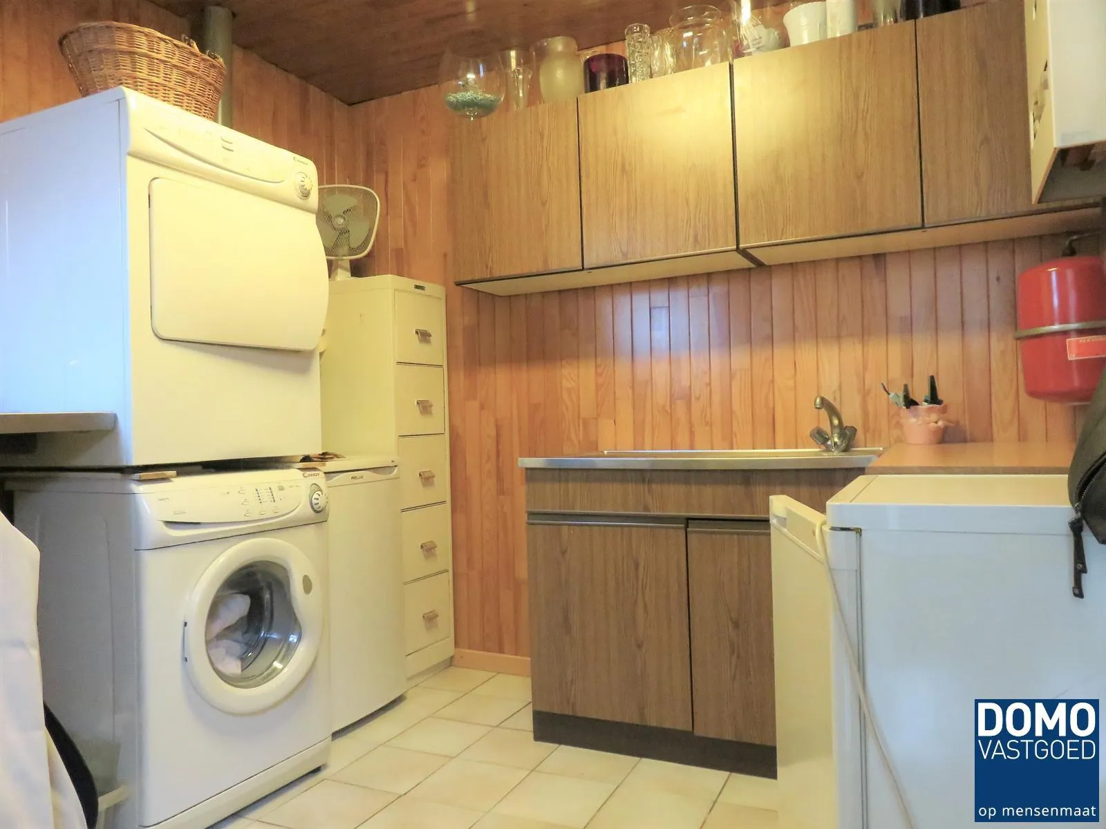 De indeling is als volgt. Gelijkvloers is er een inkomhal, gastentoilet, badkamer (lavabo, douche, bad), ruime leefruimte met hoog plafond met aangrenzend een lichtrijke keuken met aansluitende aparte wasplaats/berging.