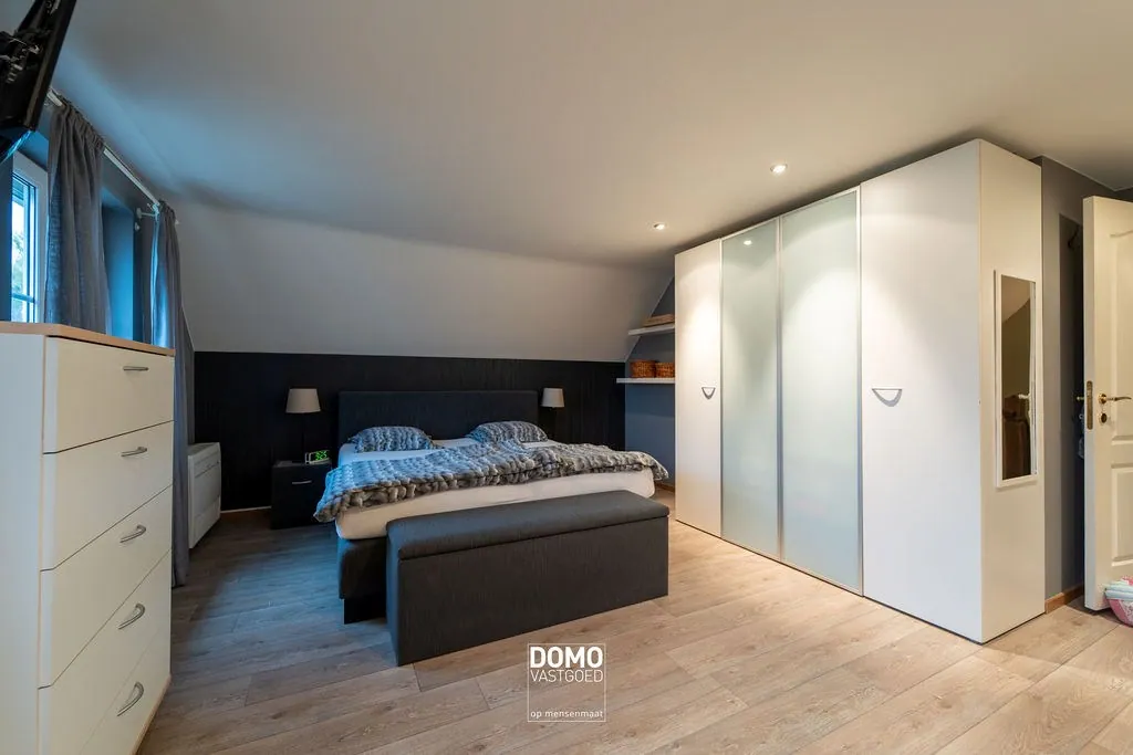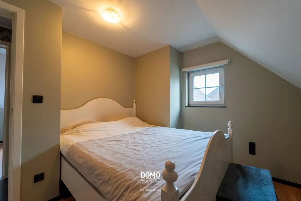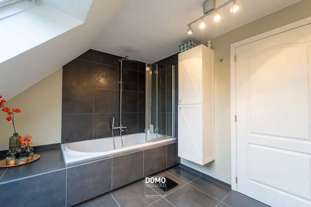De bovenverdieping telt drie comfortabele slaapkamers. De master bedroom springt eruit door haar royale afmetingen en de vele ingemaakte kasten. Ook de andere kamers zijn veelzijdig en kunnen perfect dienen als kinder-, logeer- of hobbykamer. De badkamer werd modern afgewerkt en beschikt over een dubbele wastafel. Dankzij het grote dakraam wordt de ruimte bovendien aangenaam verlicht door natuurlijk daglicht.