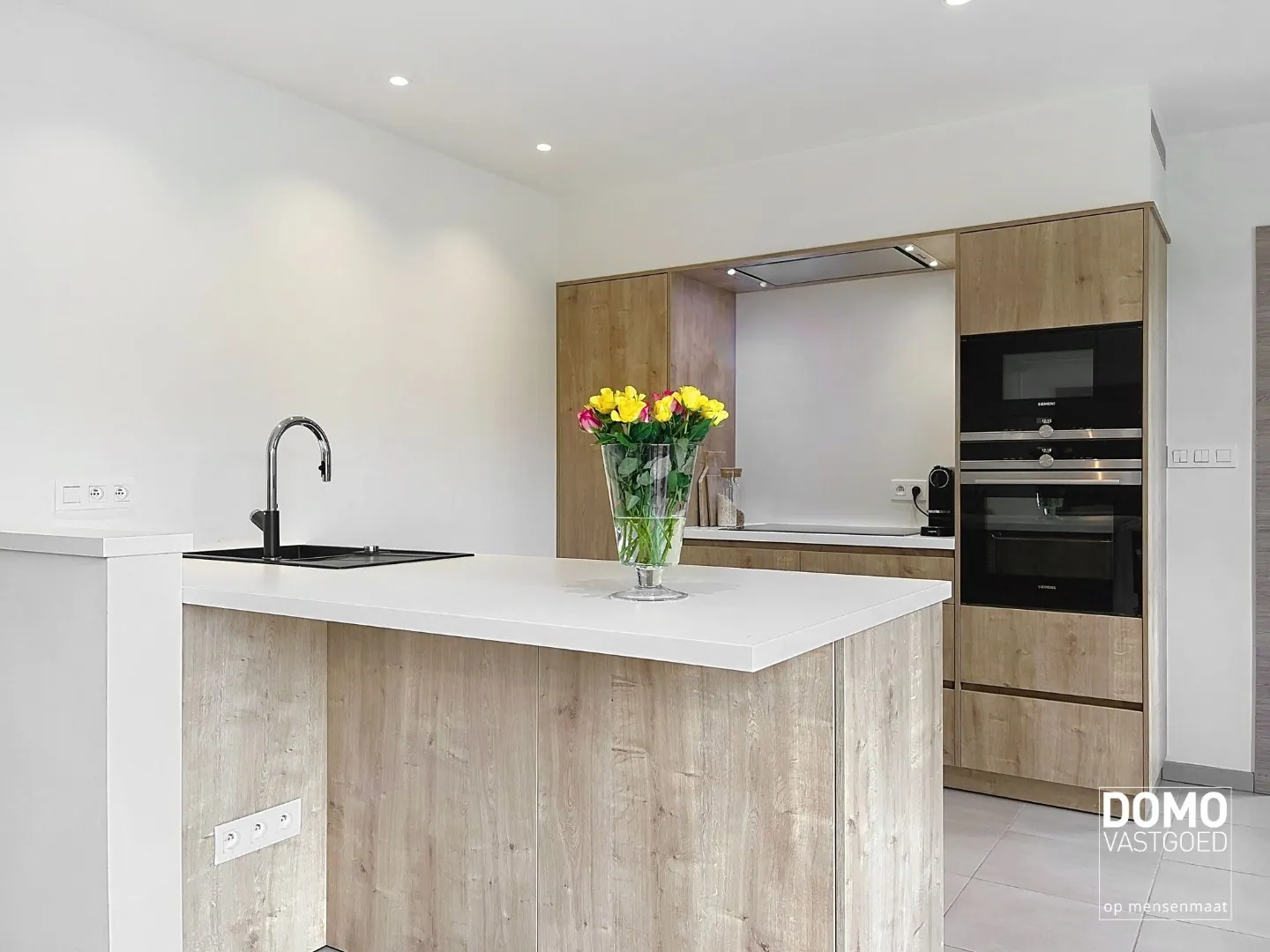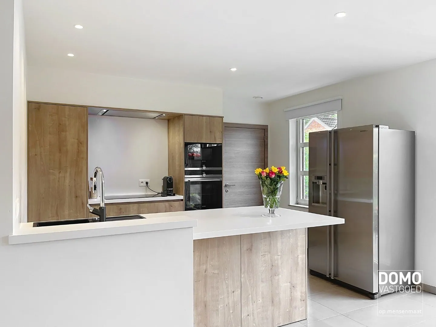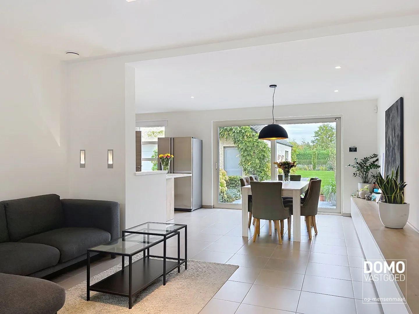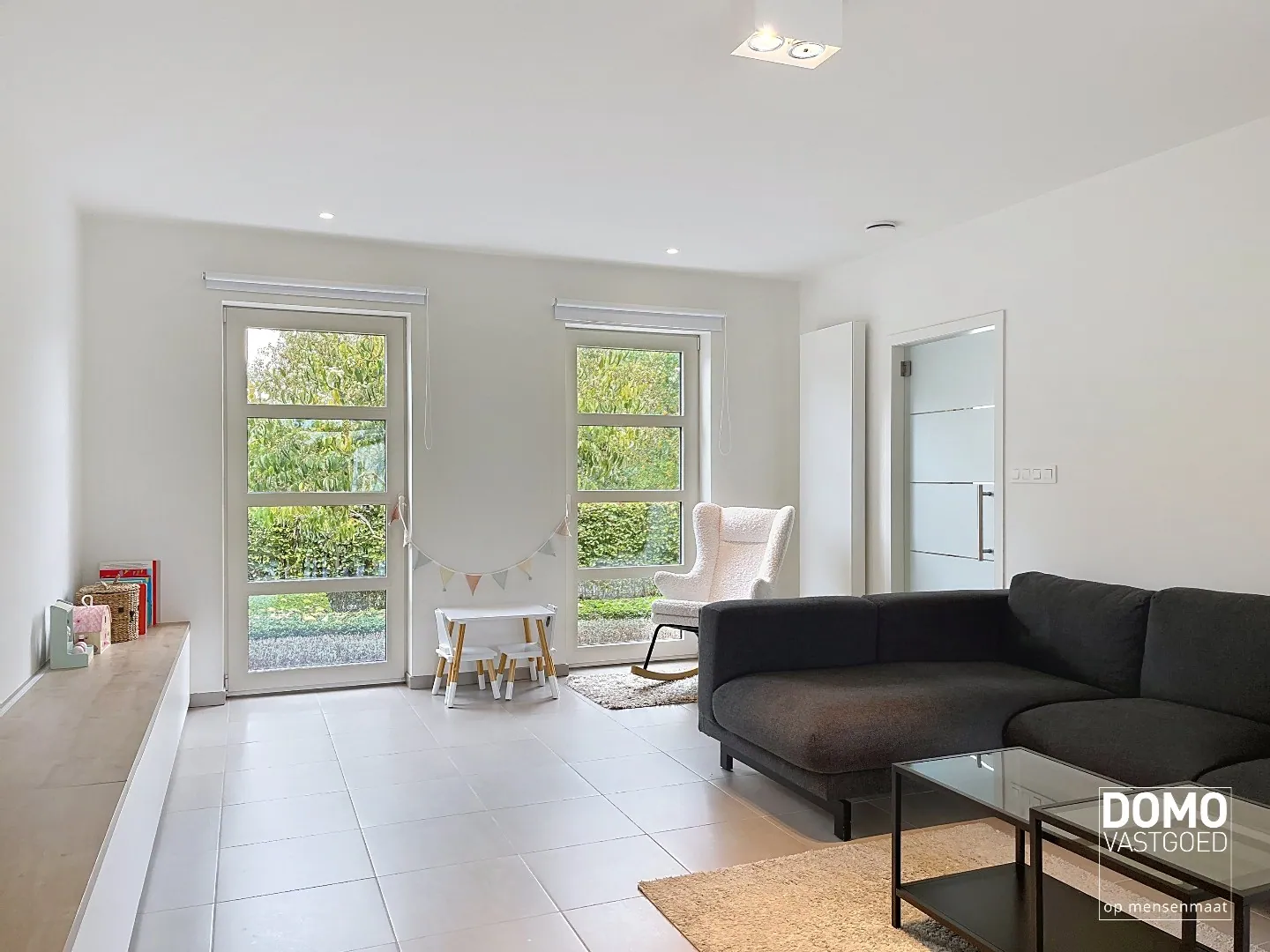 Het gelijkvloers verwelkomt je met een lichtrijke leefruimte met open keuken, uitzicht op de tuin en afgewerkt met inbouwkasten.