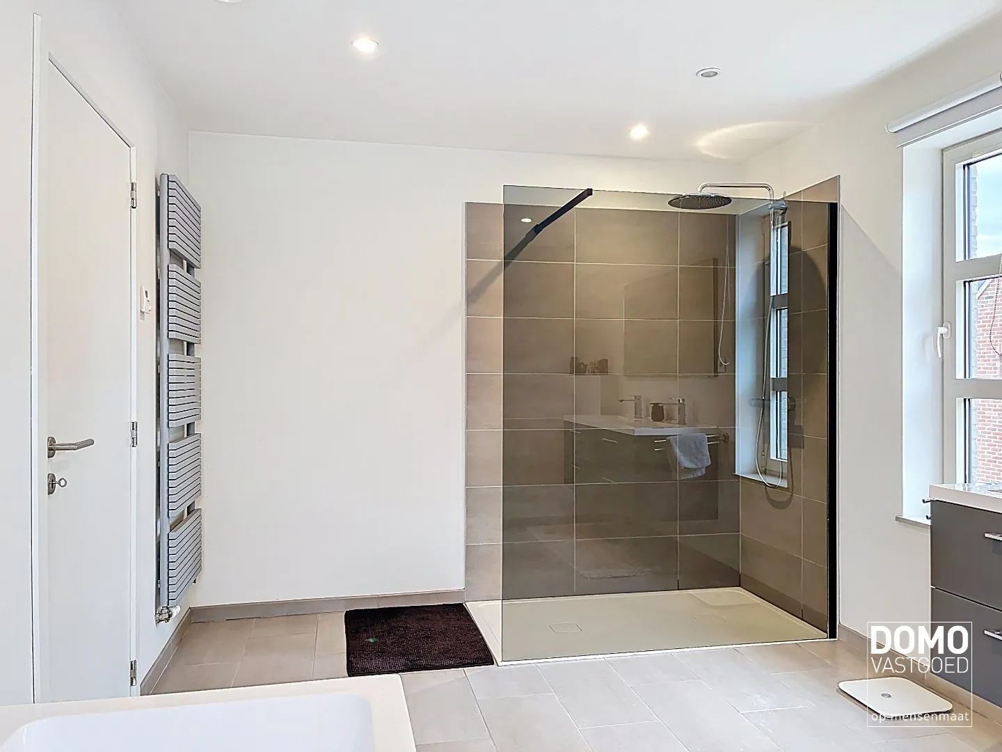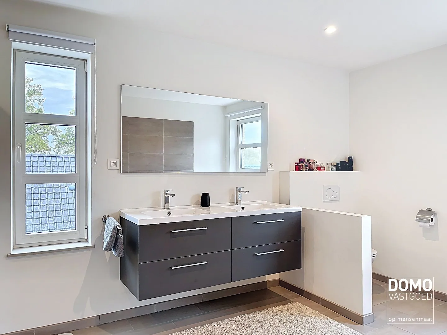 De moderne badkamer is voorzien van een dubbele lavabo, inloopdouche, bad en toilet.